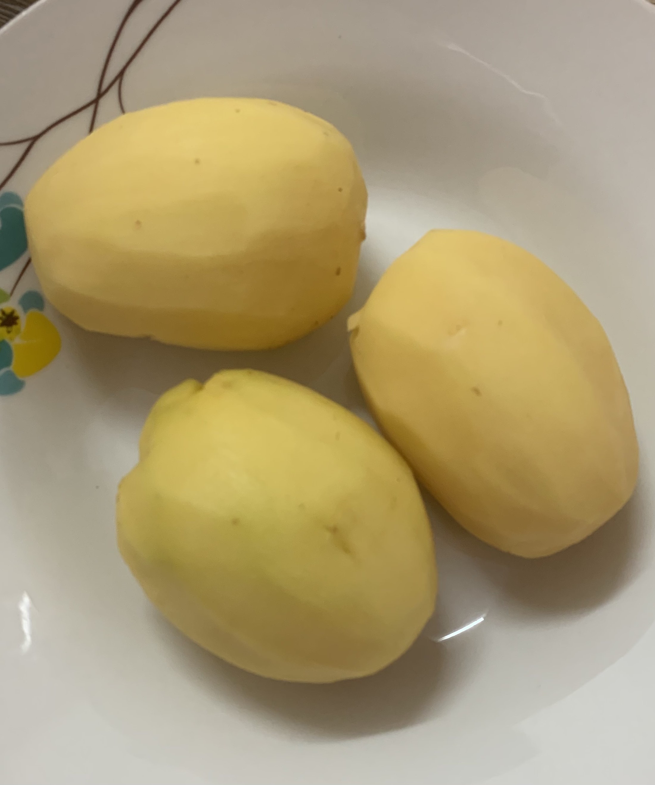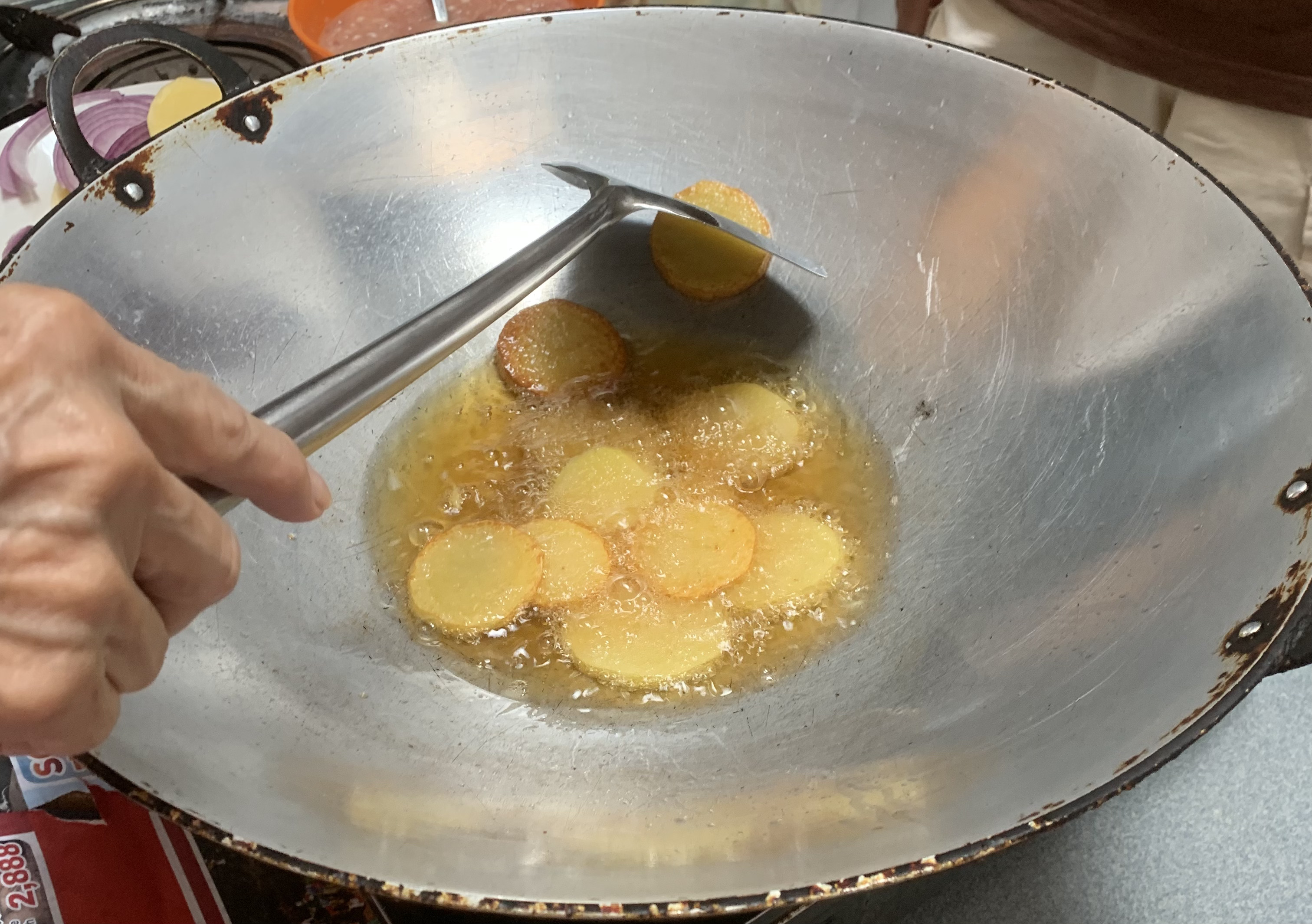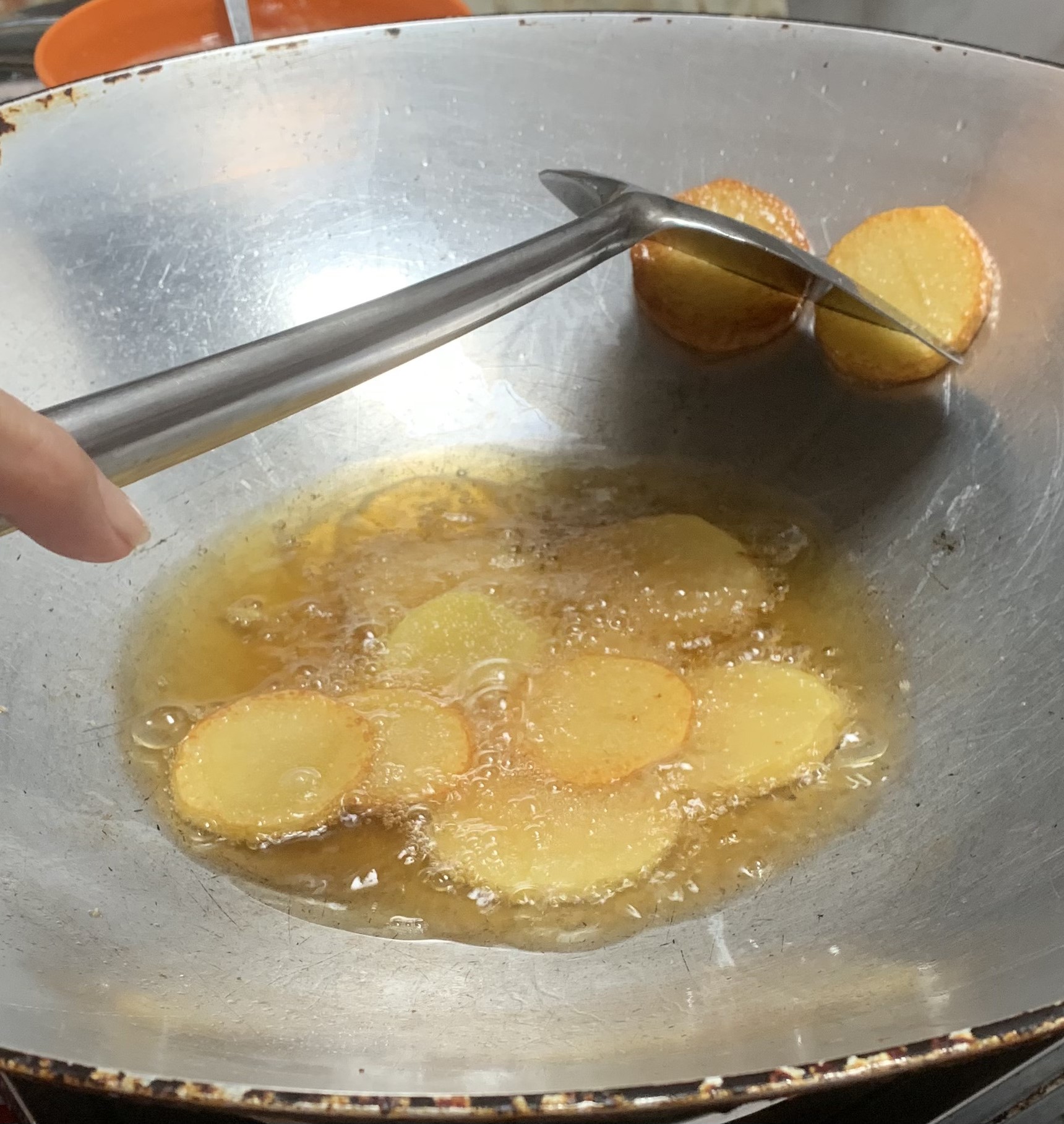 Heat the oil using high heat. Put in the potatoes and fry until the edges are golden. Lower to medium heat once the oil is hot. Once golden, push potatoes out of the oil to drip dry at the side of the wok, then transfer to a plate.