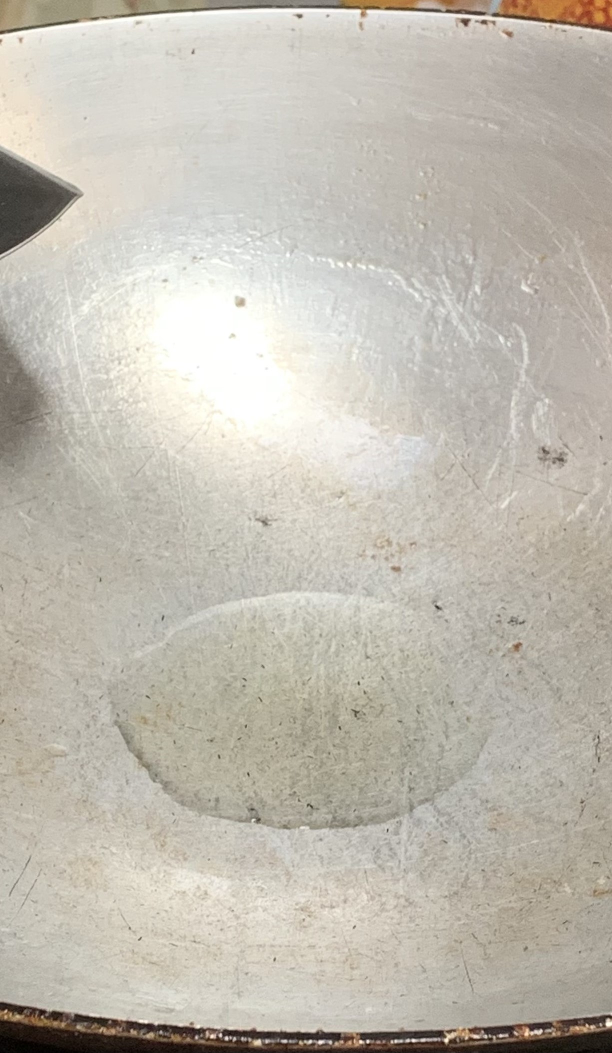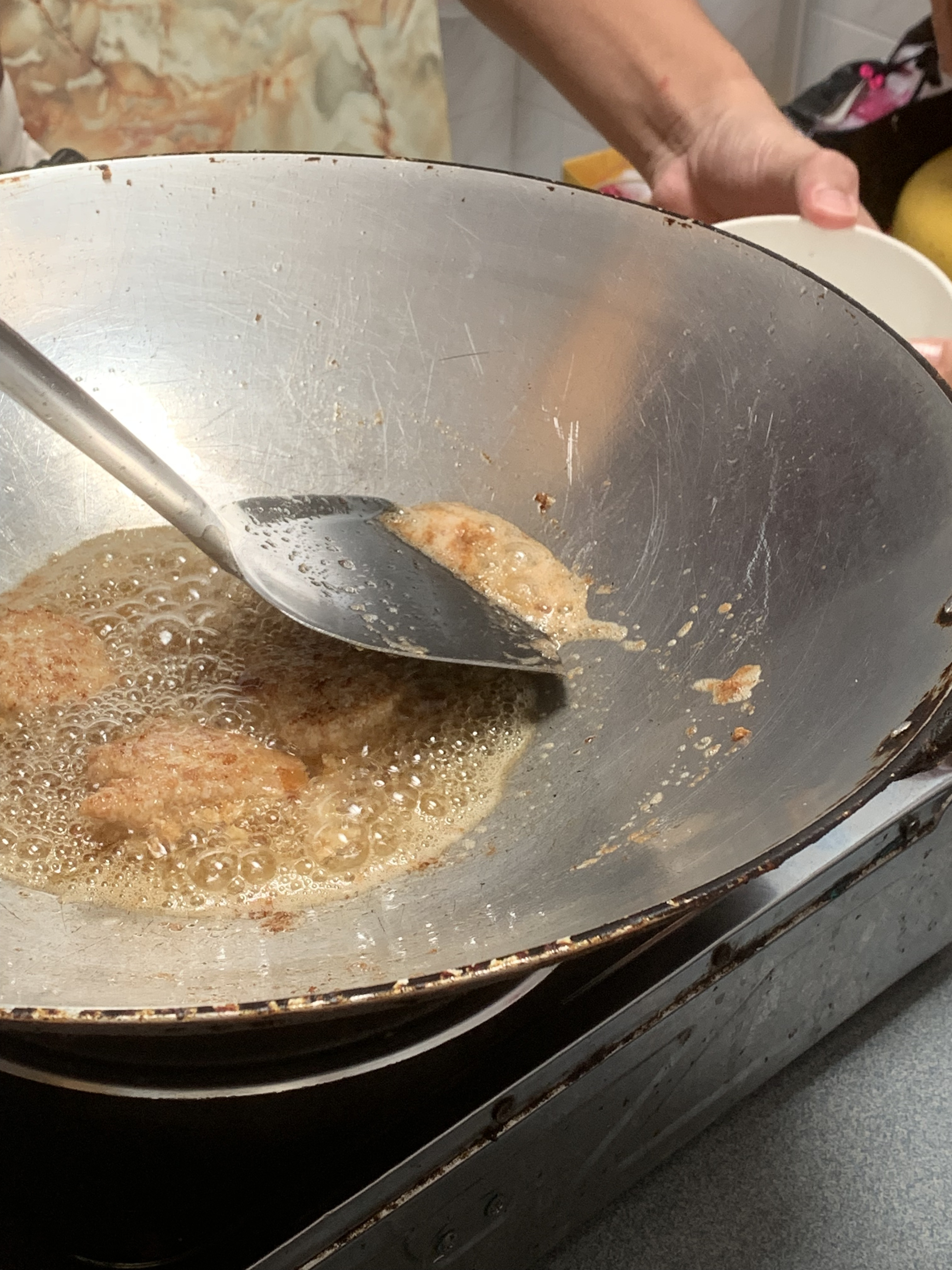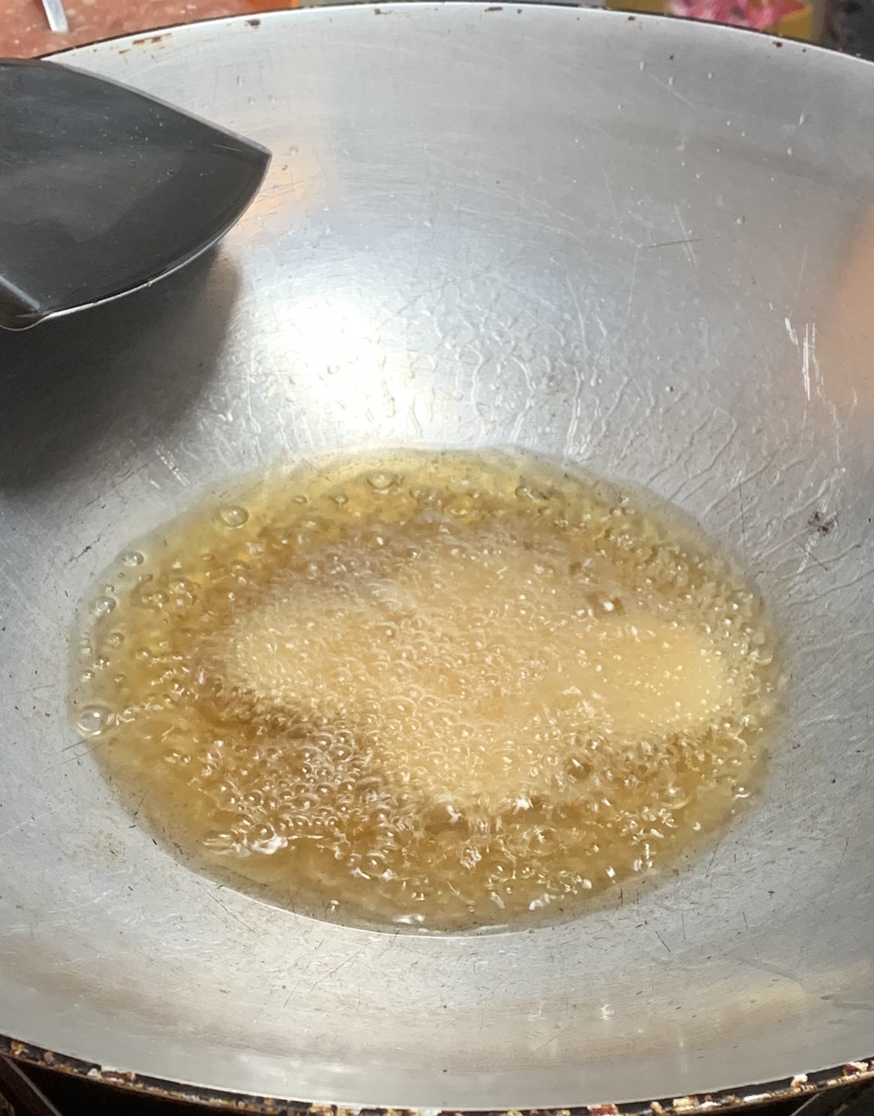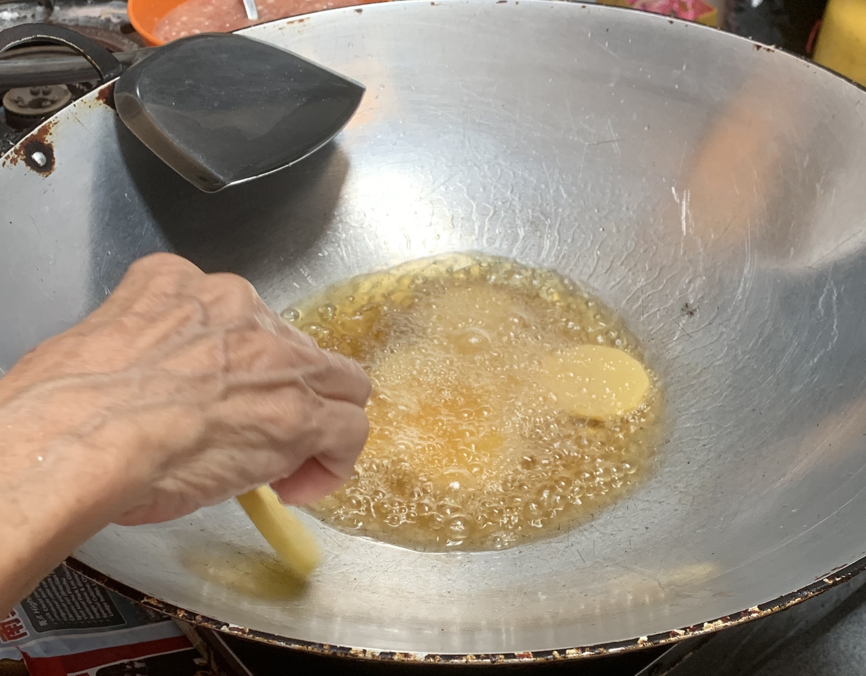 Heat the oil using high heat. Put in the potatoes and fry until the edges are golden. Lower to medium heat once the oil is hot. Once golden, push potatoes out of the oil to drip dry at the side of the wok, then transfer to a plate.