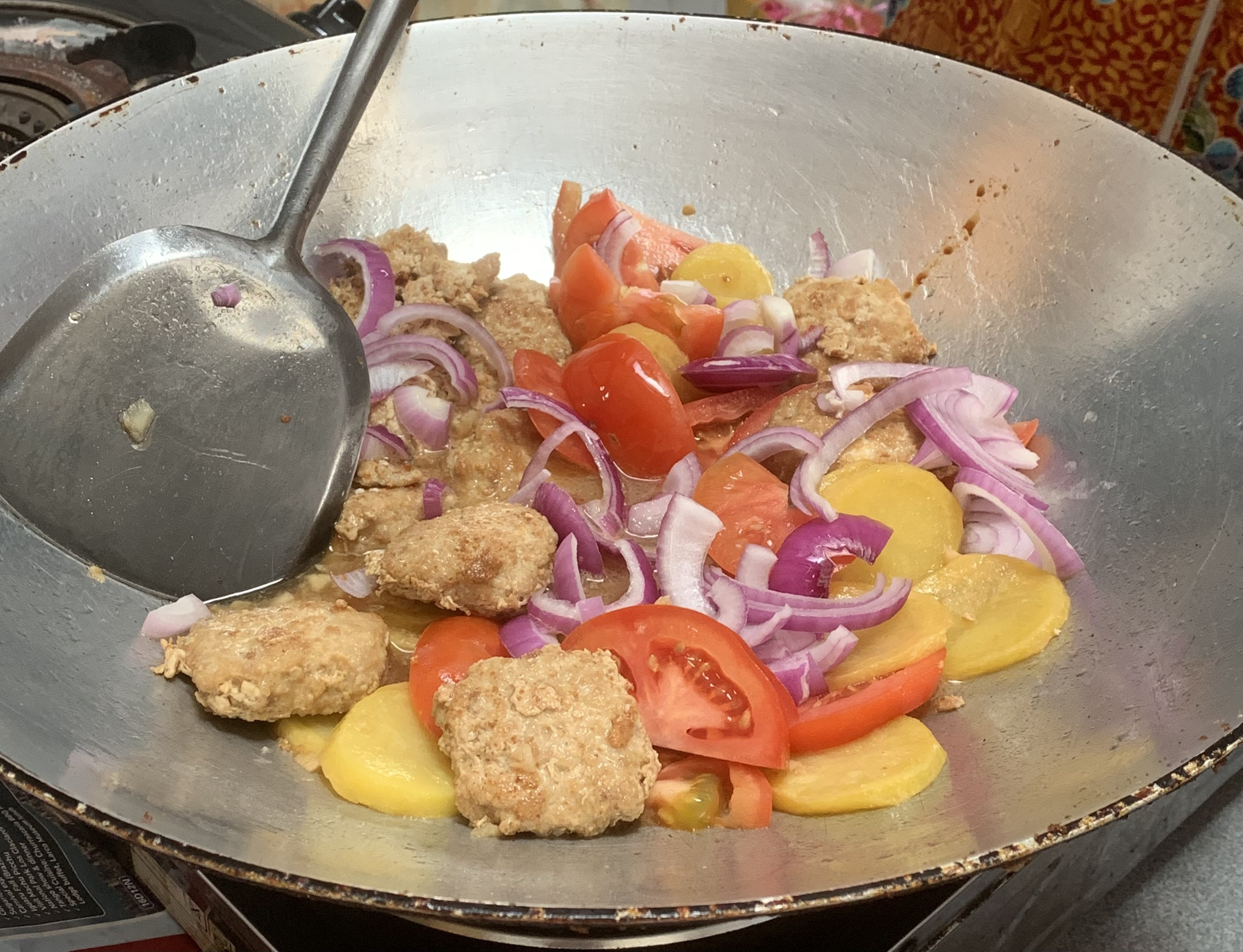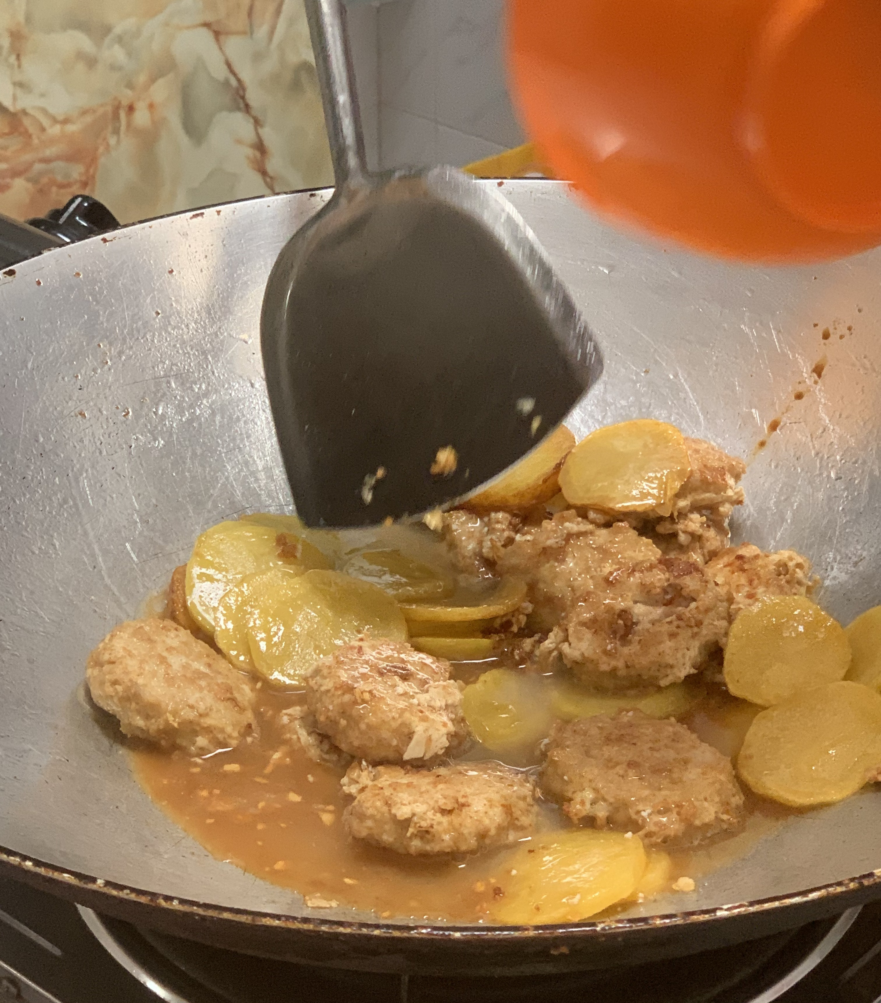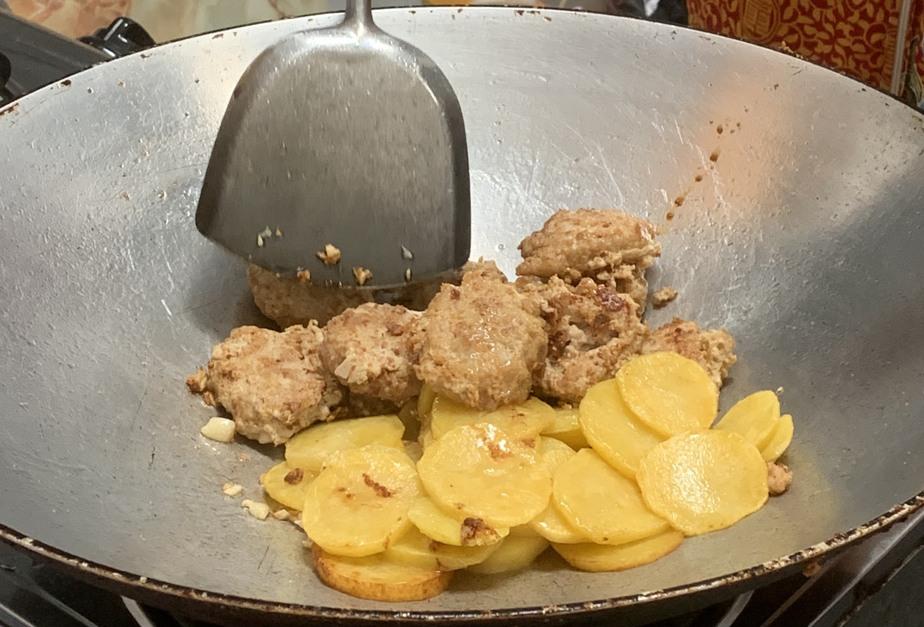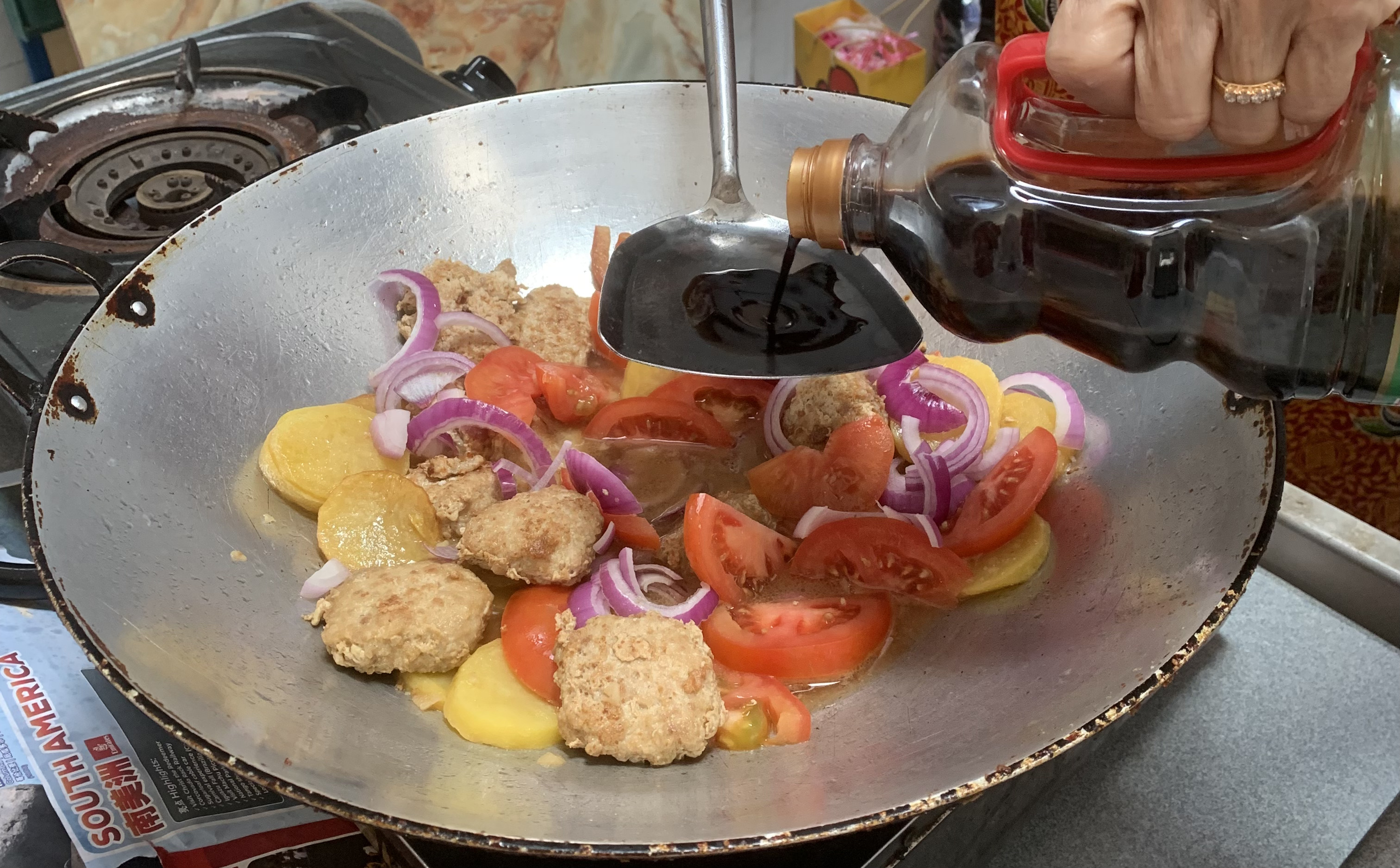 Clear the old oil and add a bit of new oil. Add garlic, then light soy sauce, then the potatoes and meatballs, then a bit of water (rinse out the bowl that was used for the meat mixture), then onions and tomatoes. Add more soy sauce. Done!