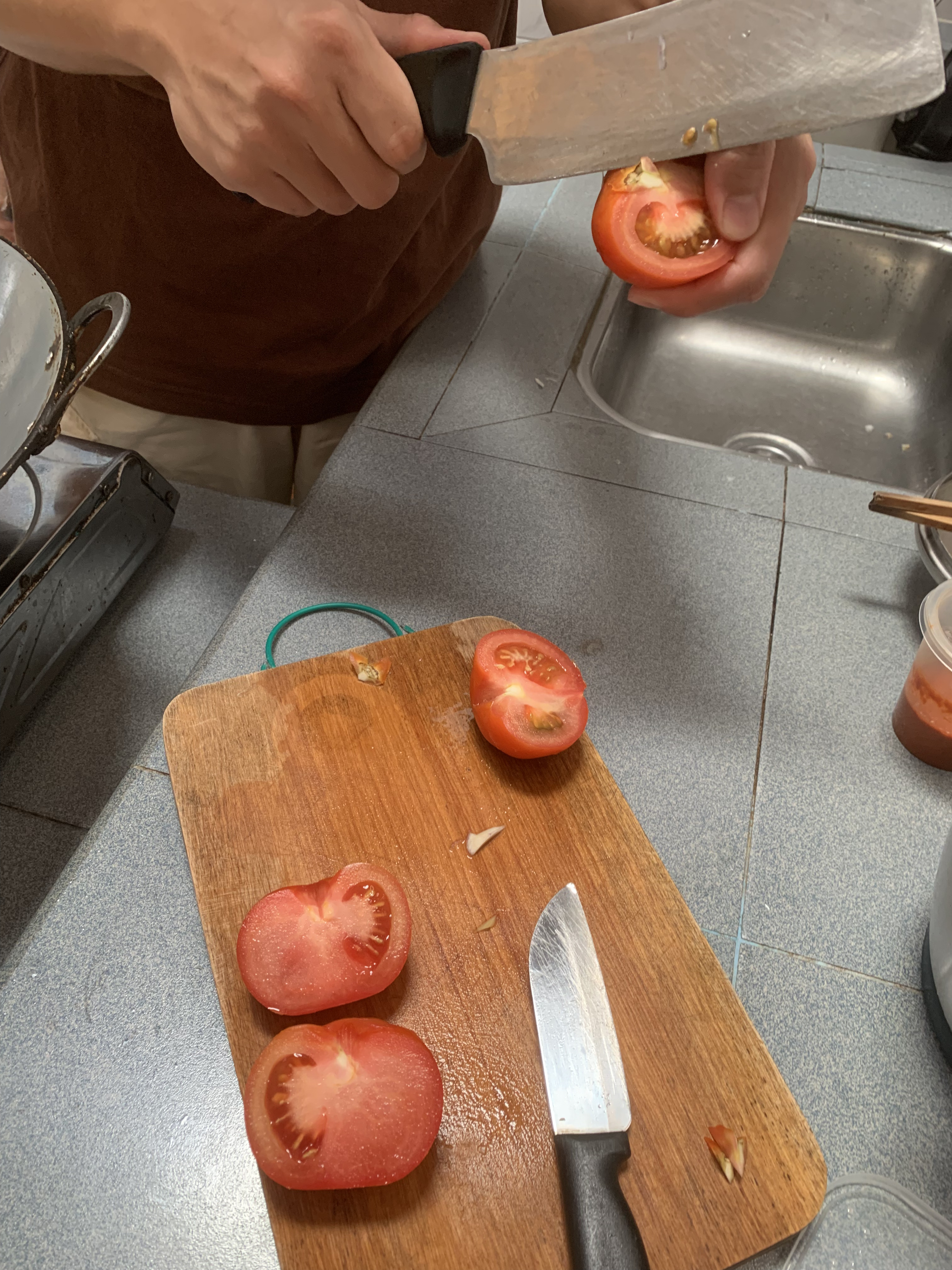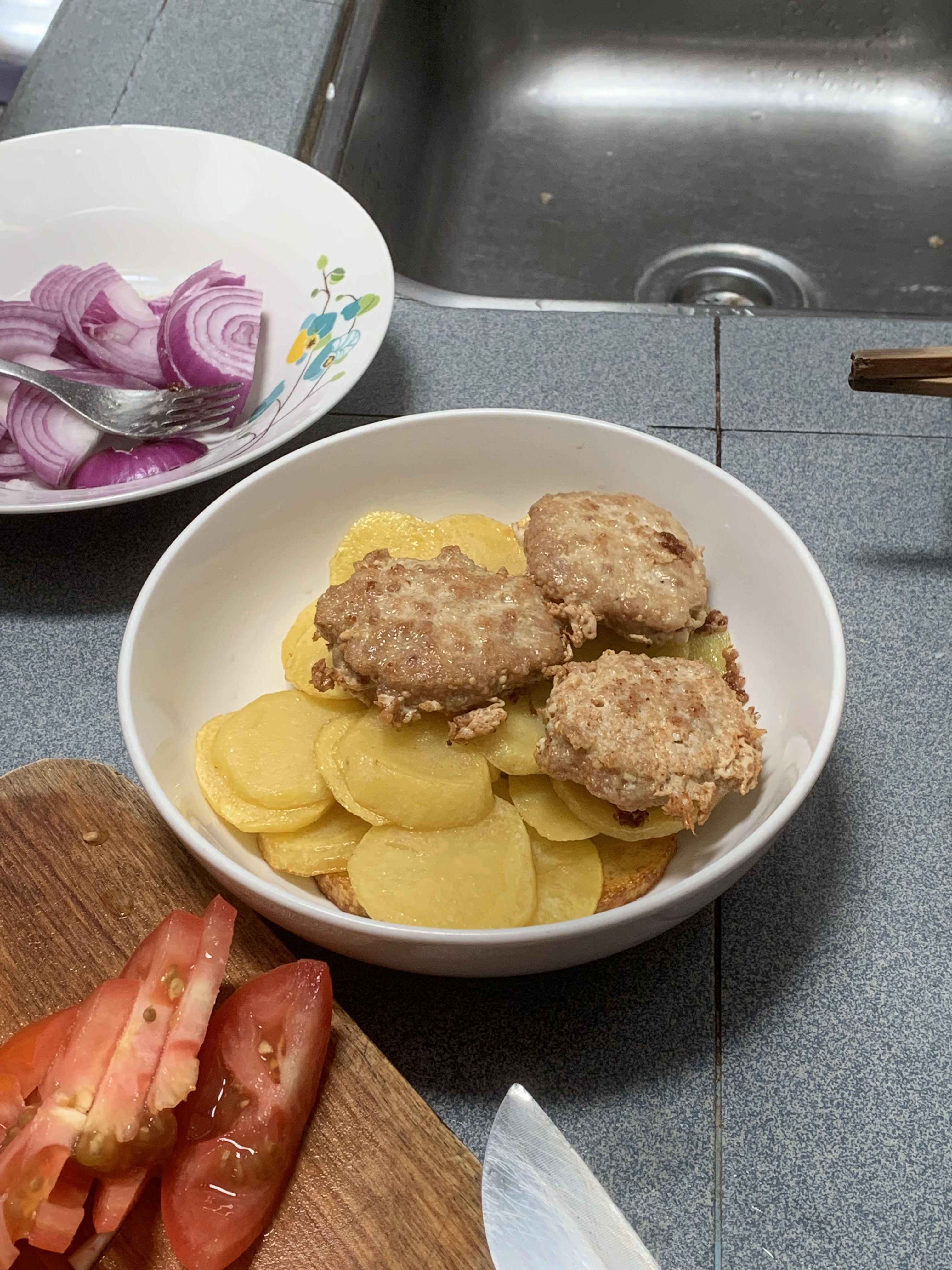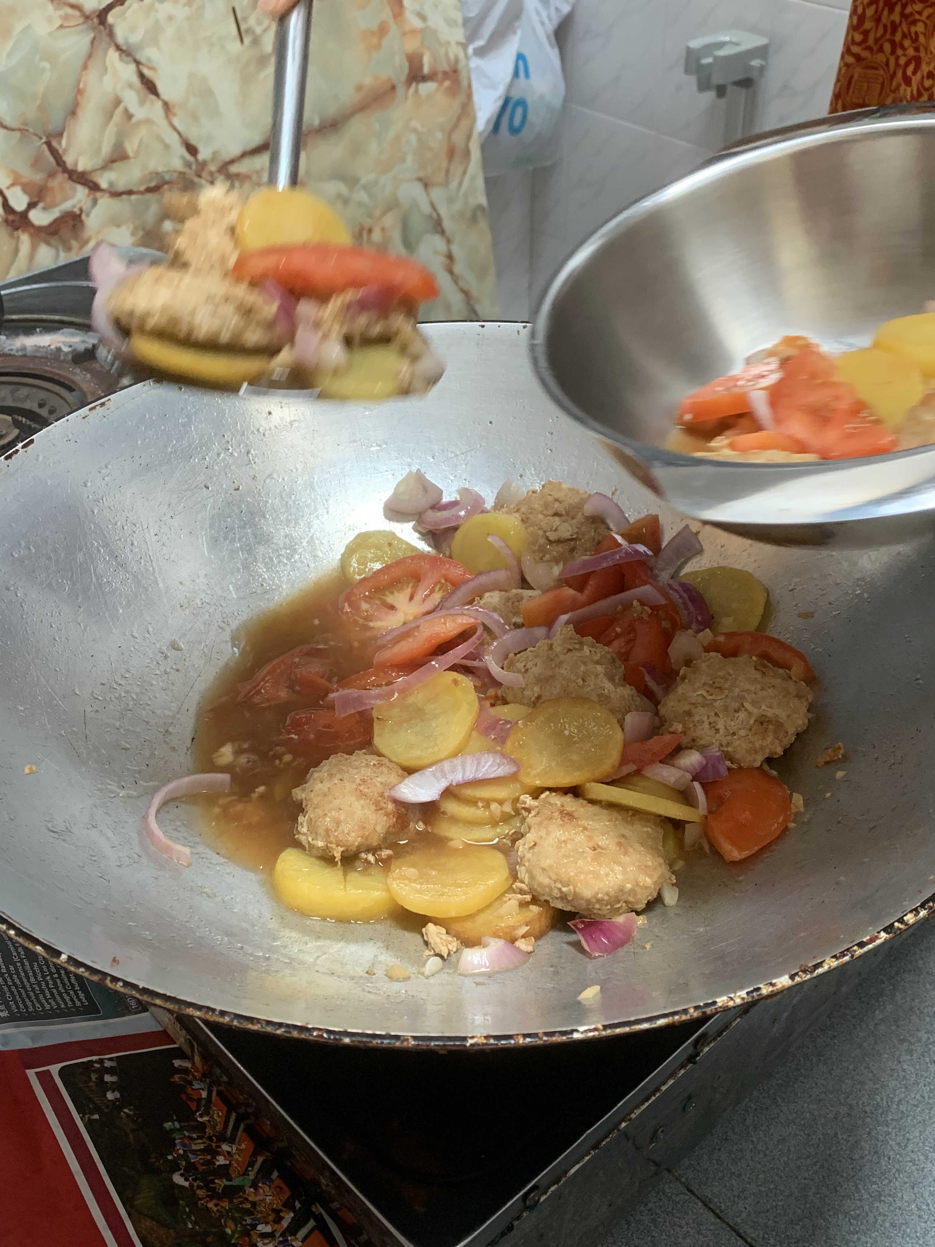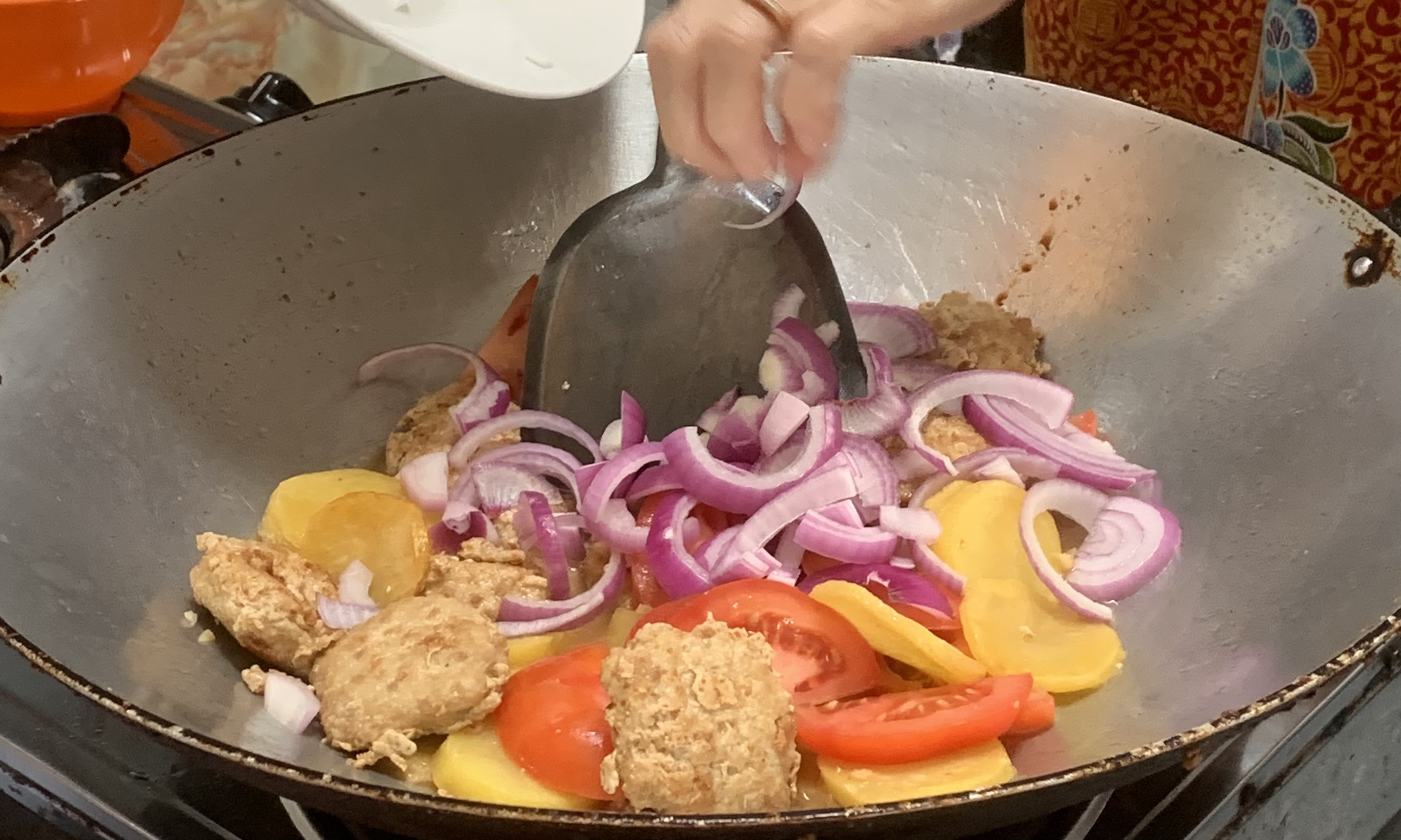 Clear the old oil and add a bit of new oil. Add garlic, then light soy sauce, then the potatoes and meatballs, then a bit of water (rinse out the bowl that was used for the meat mixture), then onions and tomatoes. Add more soy sauce. Done!
