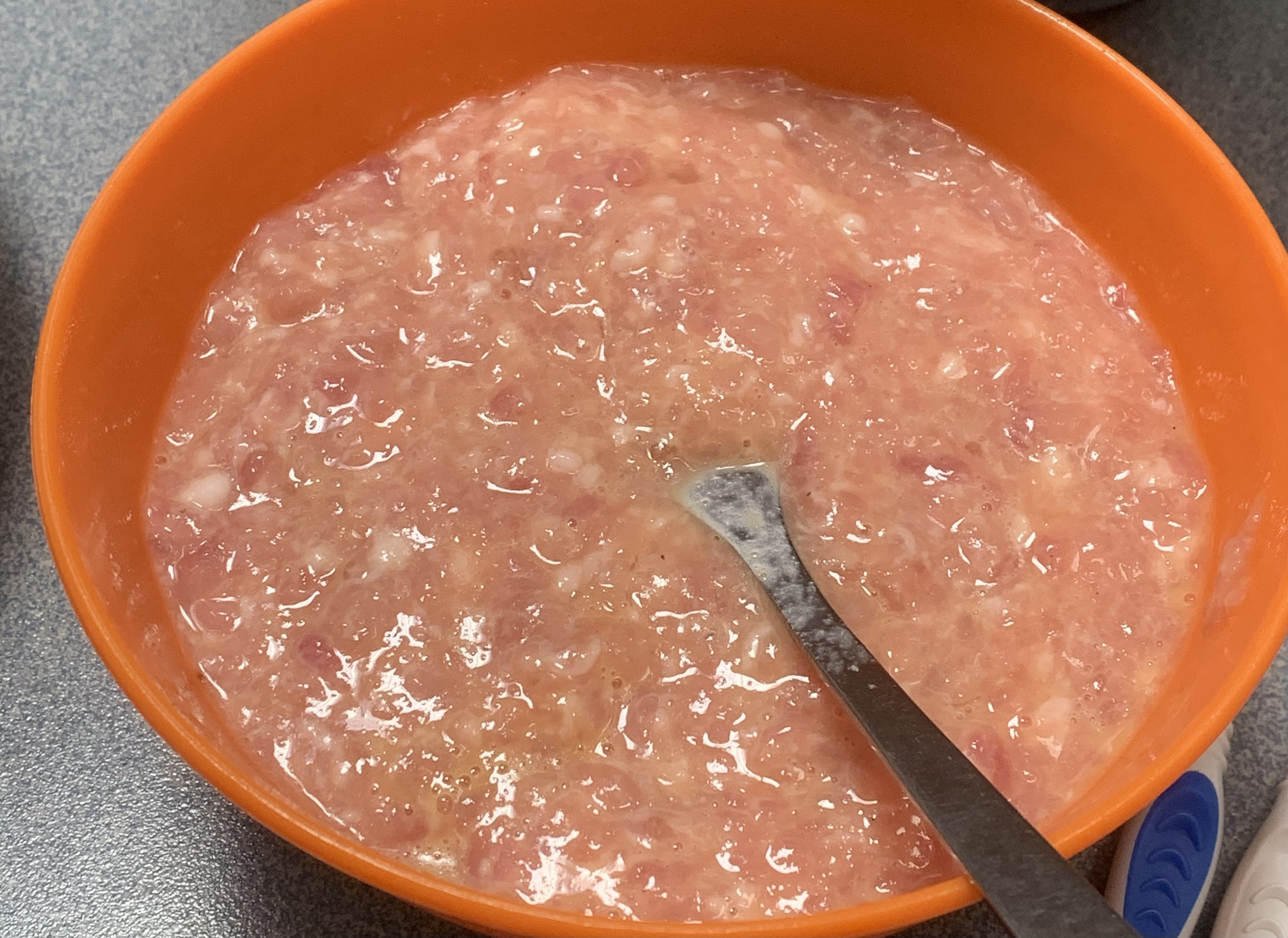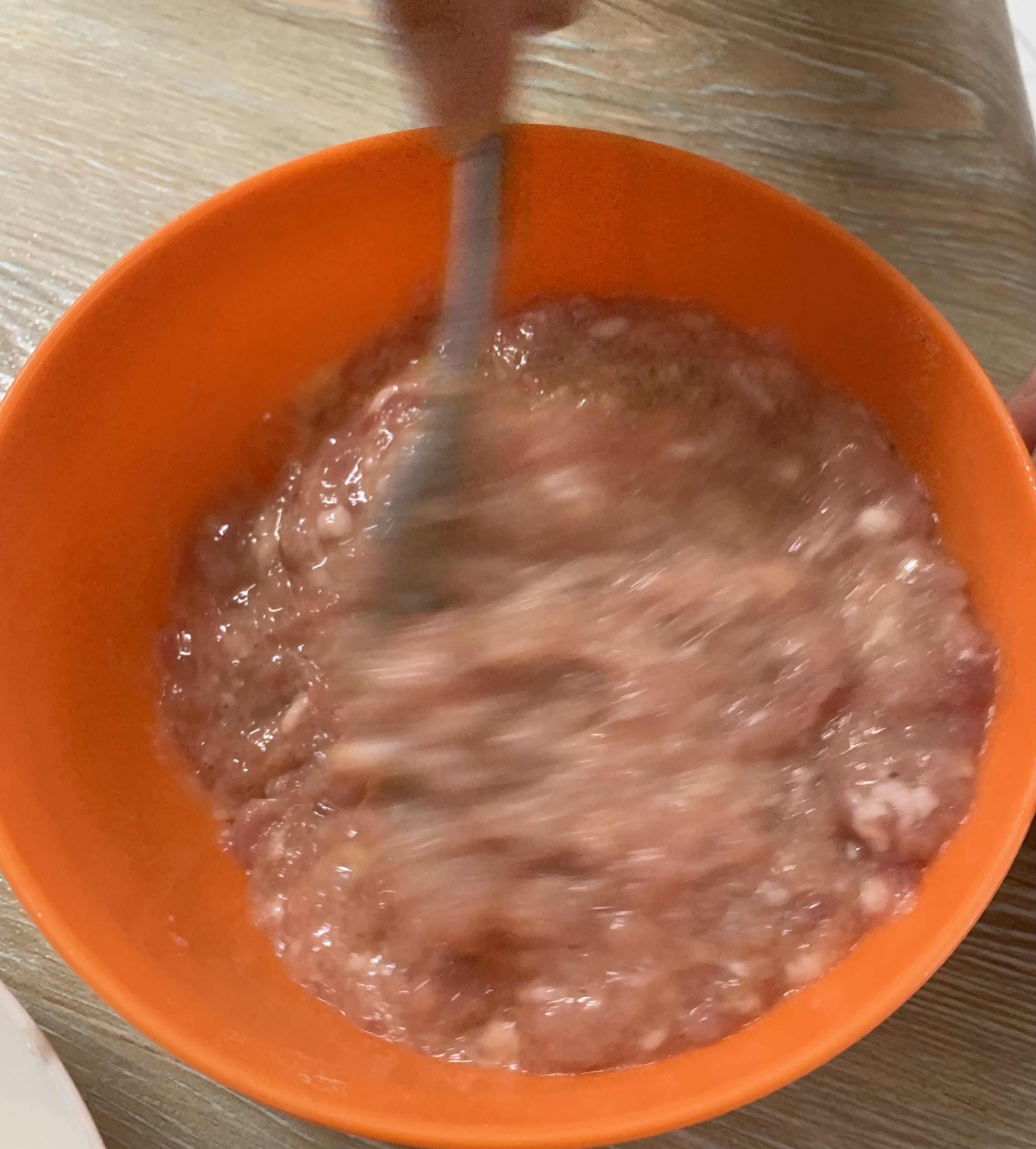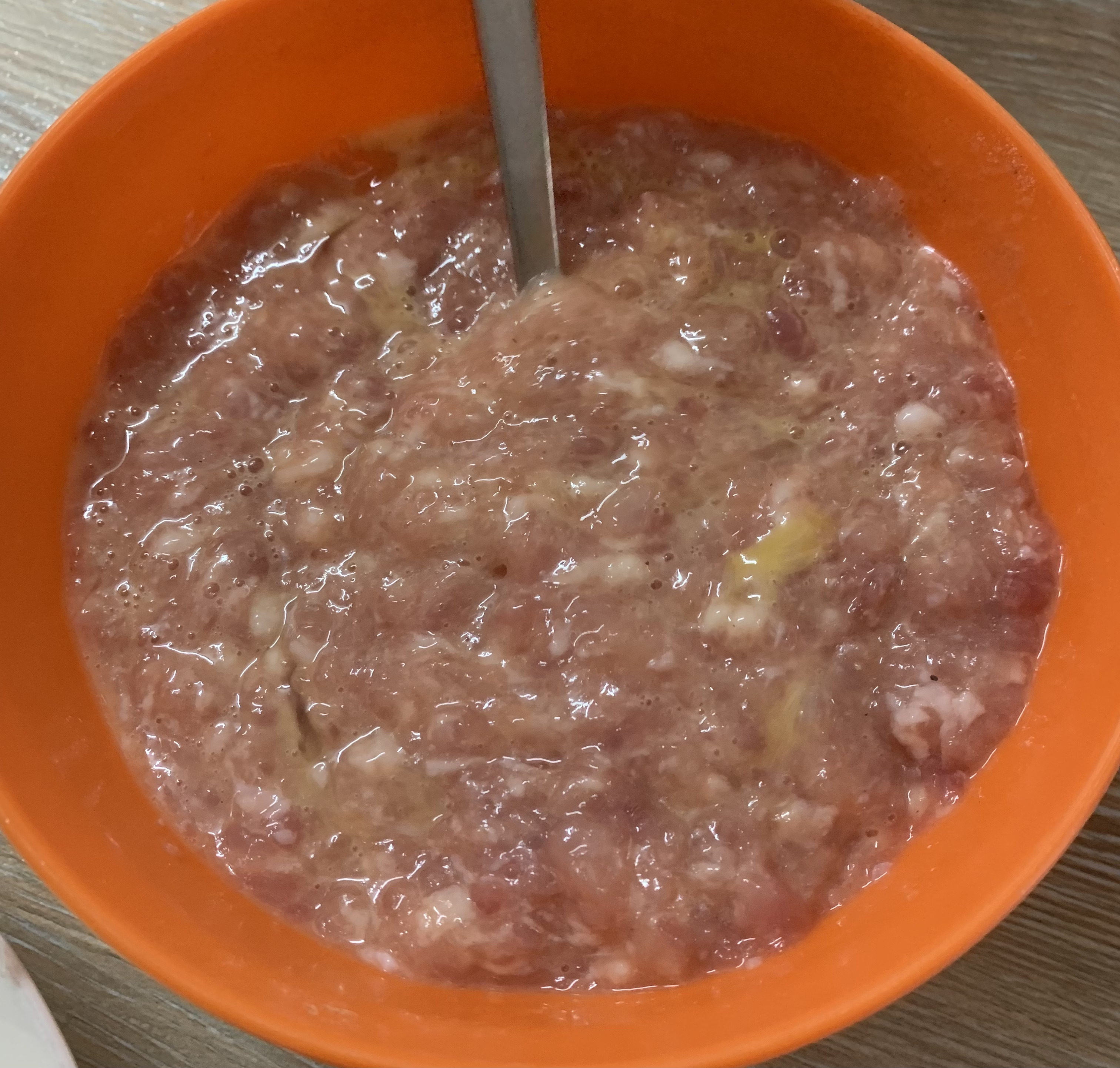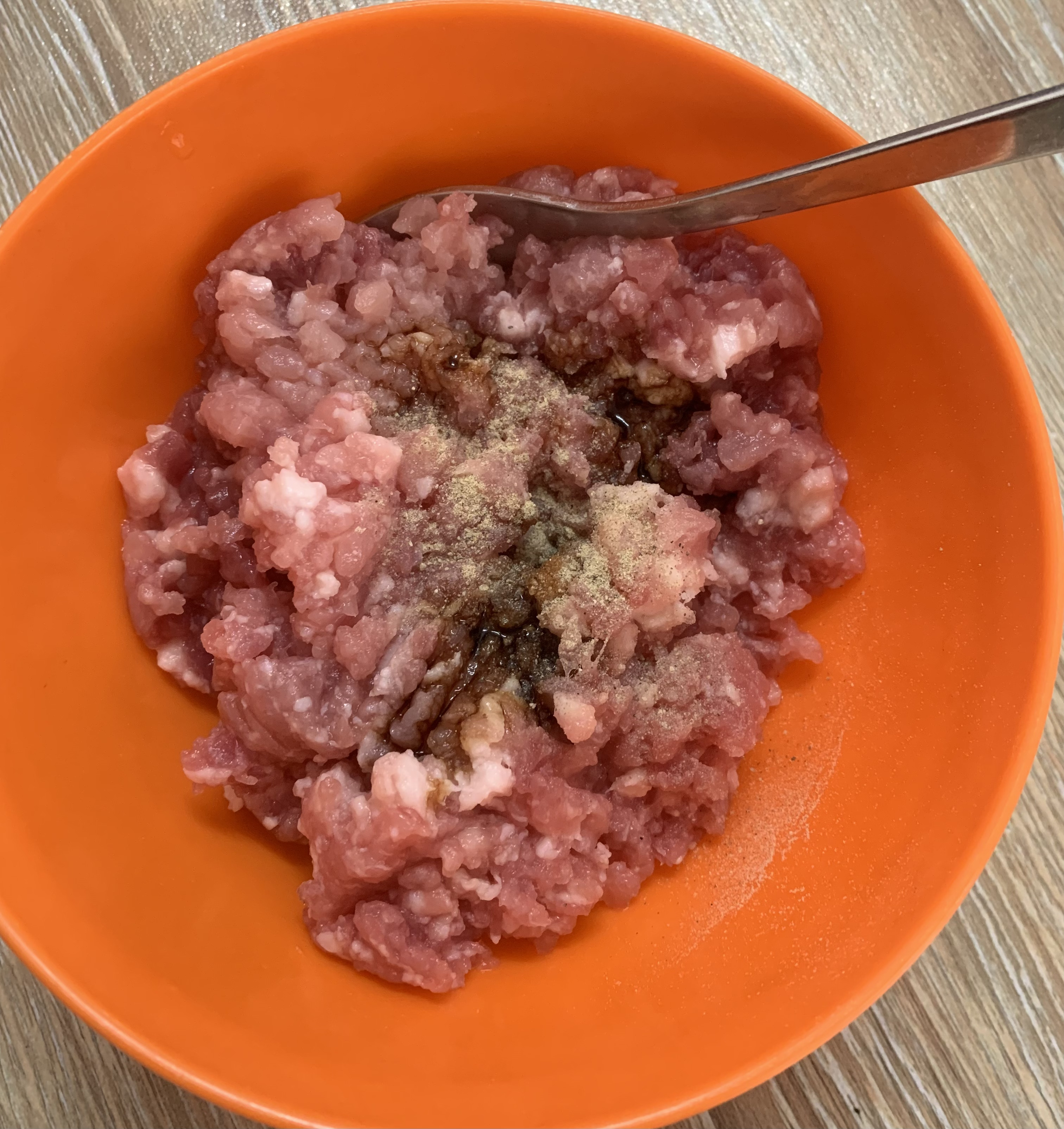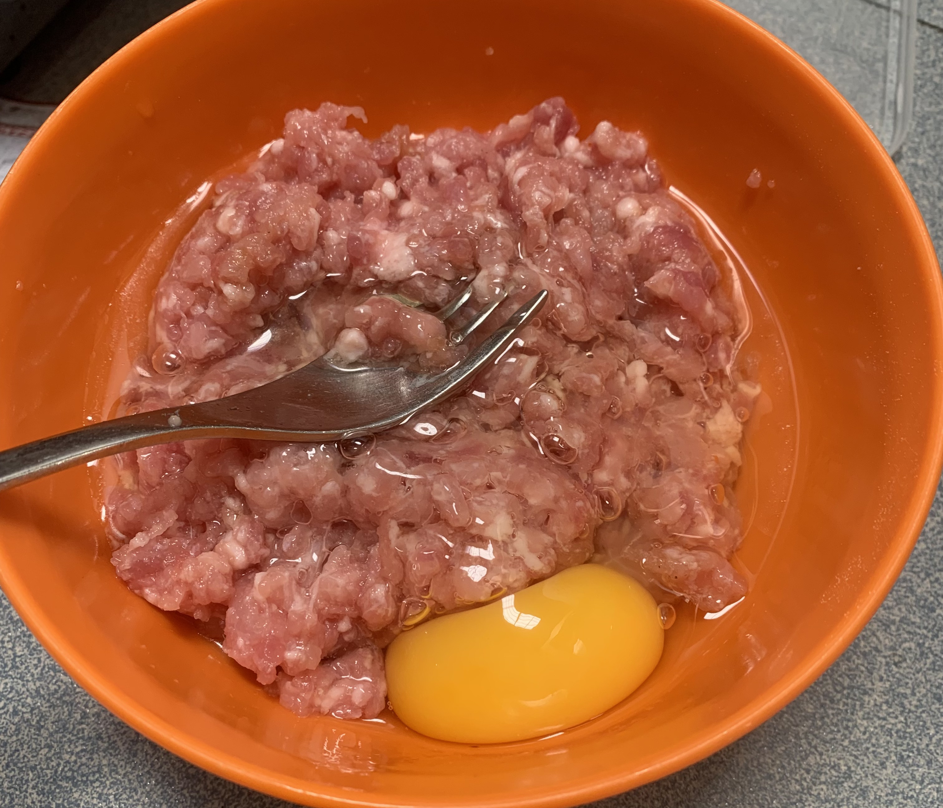 Put minced pork in a bowl. Add white pepper, soy sauce, and an egg (or two, if you have more meat). Mix.
