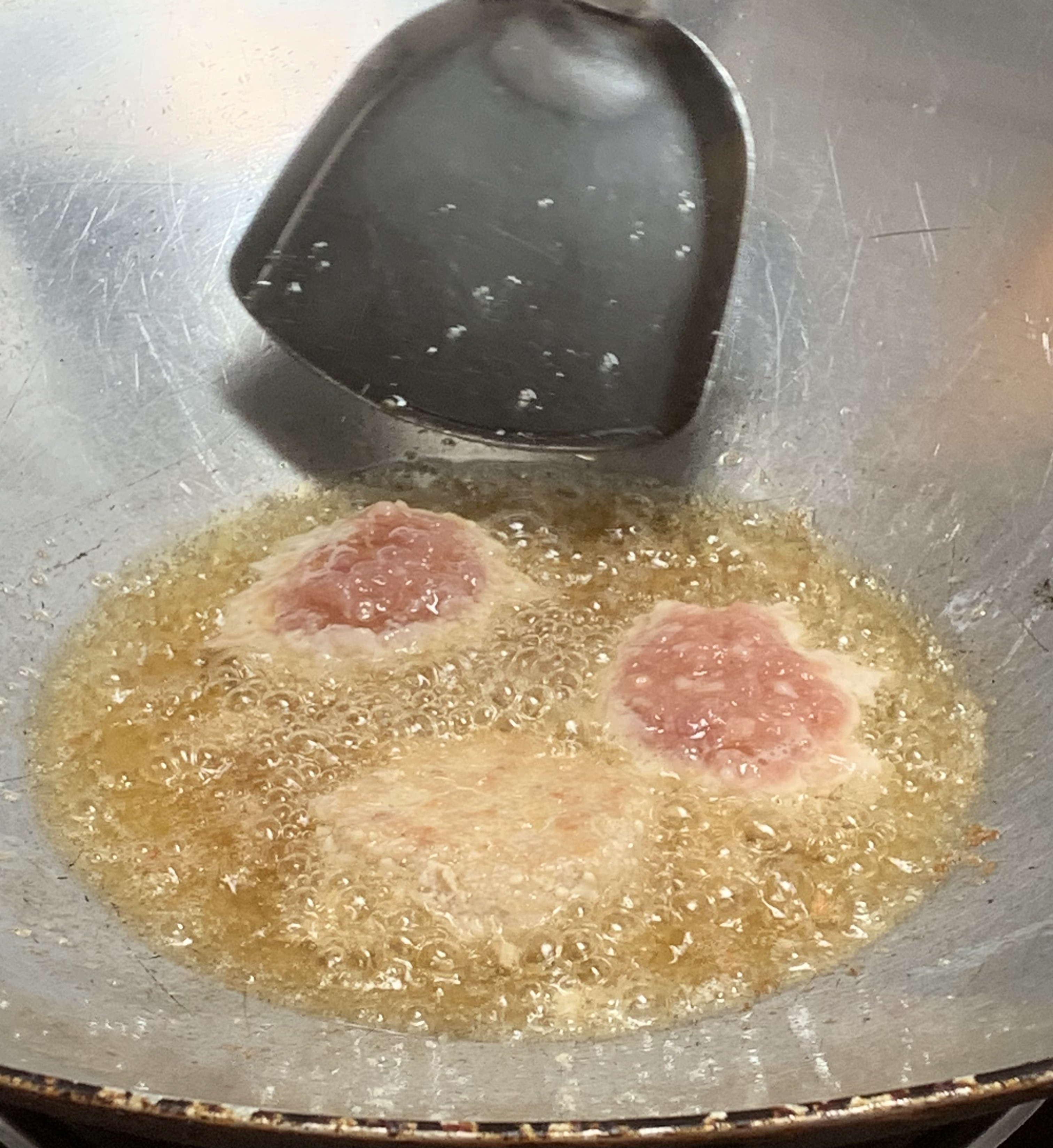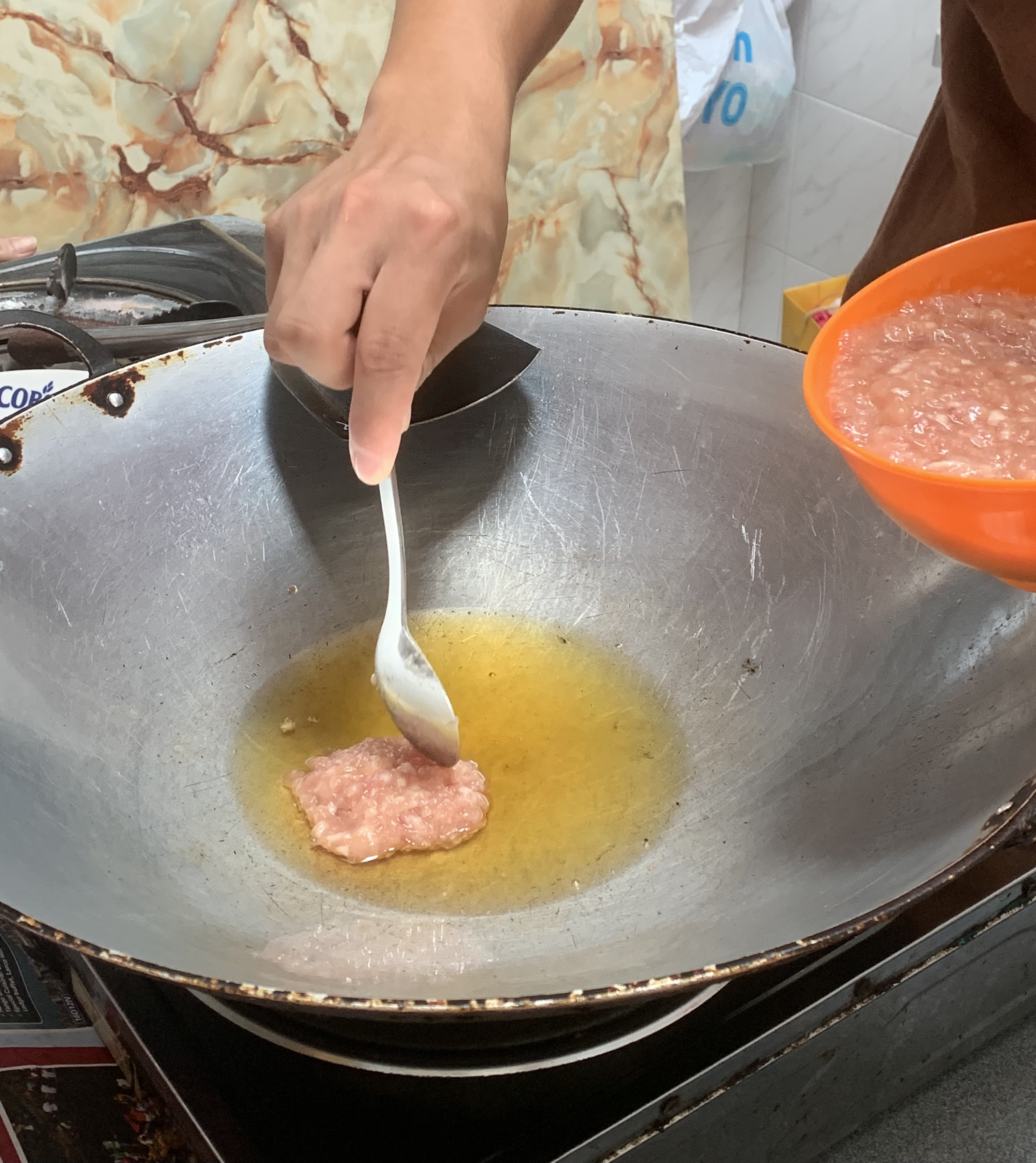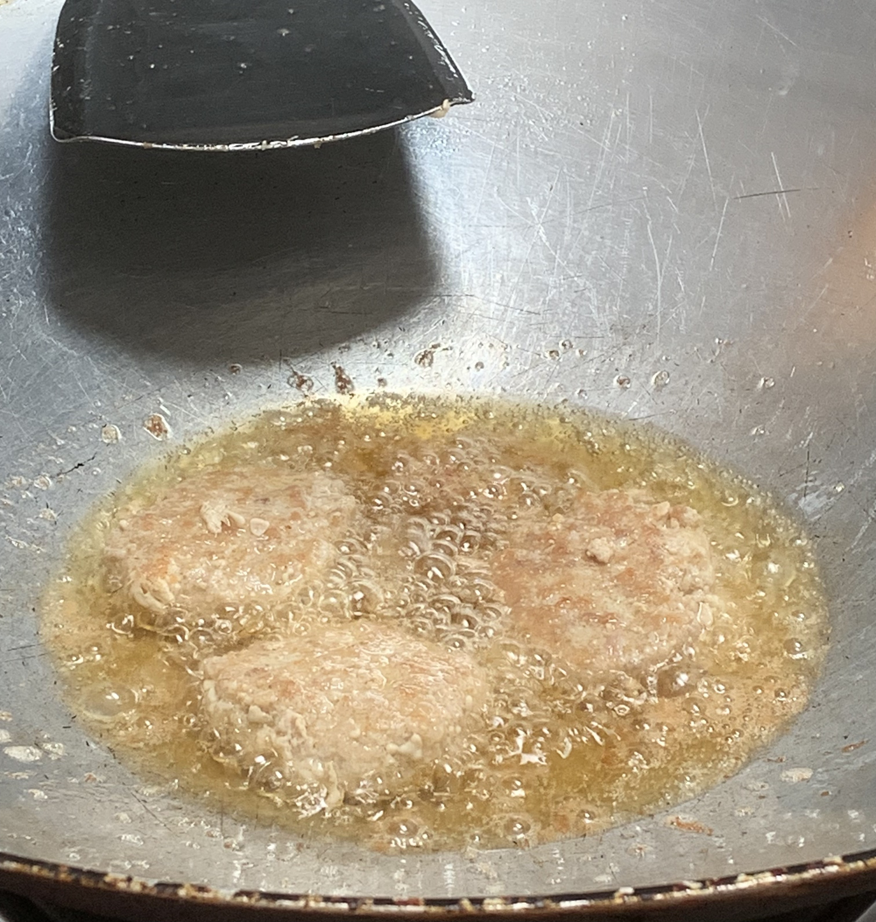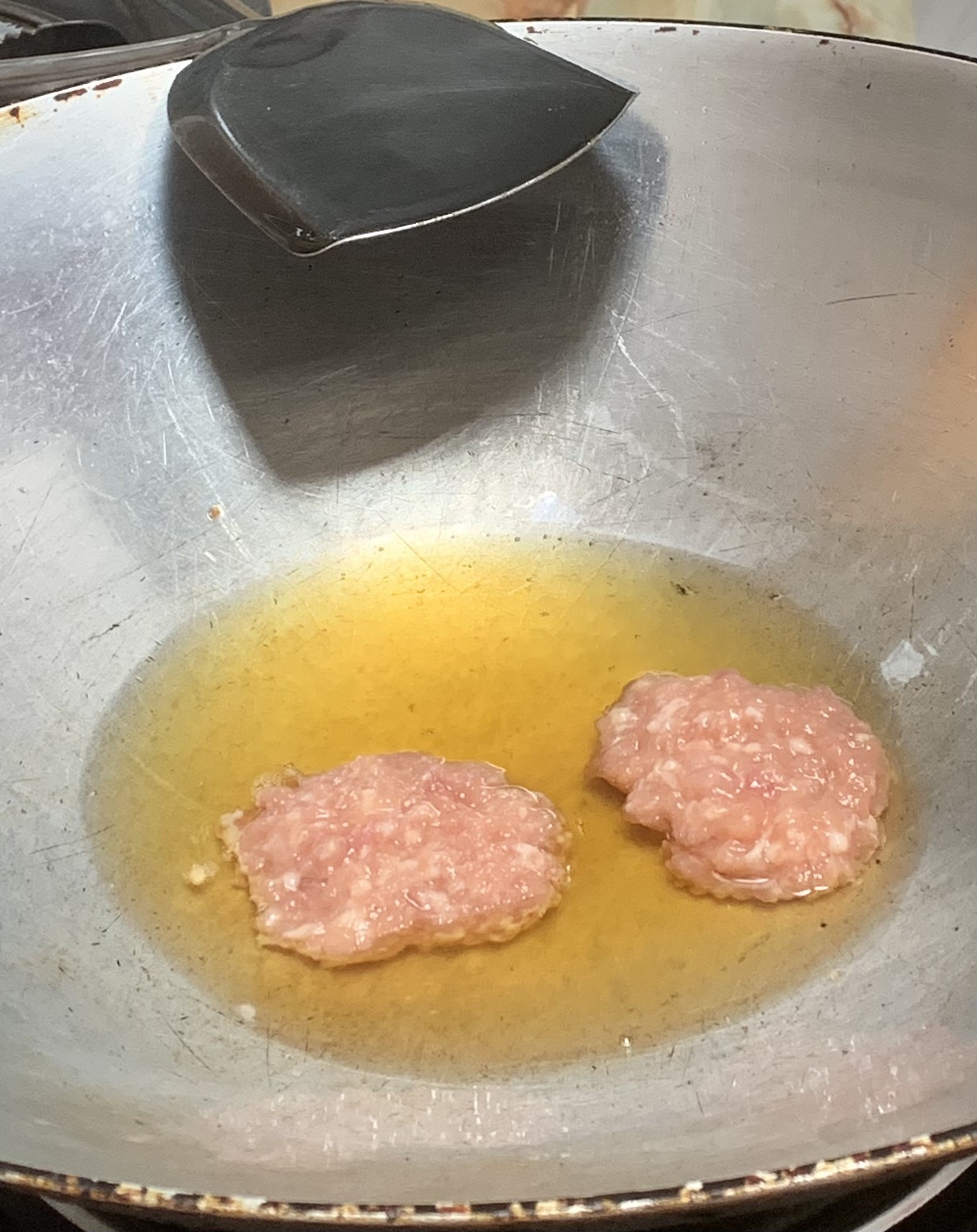 Plop a spoonful of the meat mixture into the hot oil. Flip the meatballs when they're solid and flippable. When nicely brown, push them to the side to drip dry then transfer to a plate. Before adding the next batch of meat, scoop the weird bits out of the oil.