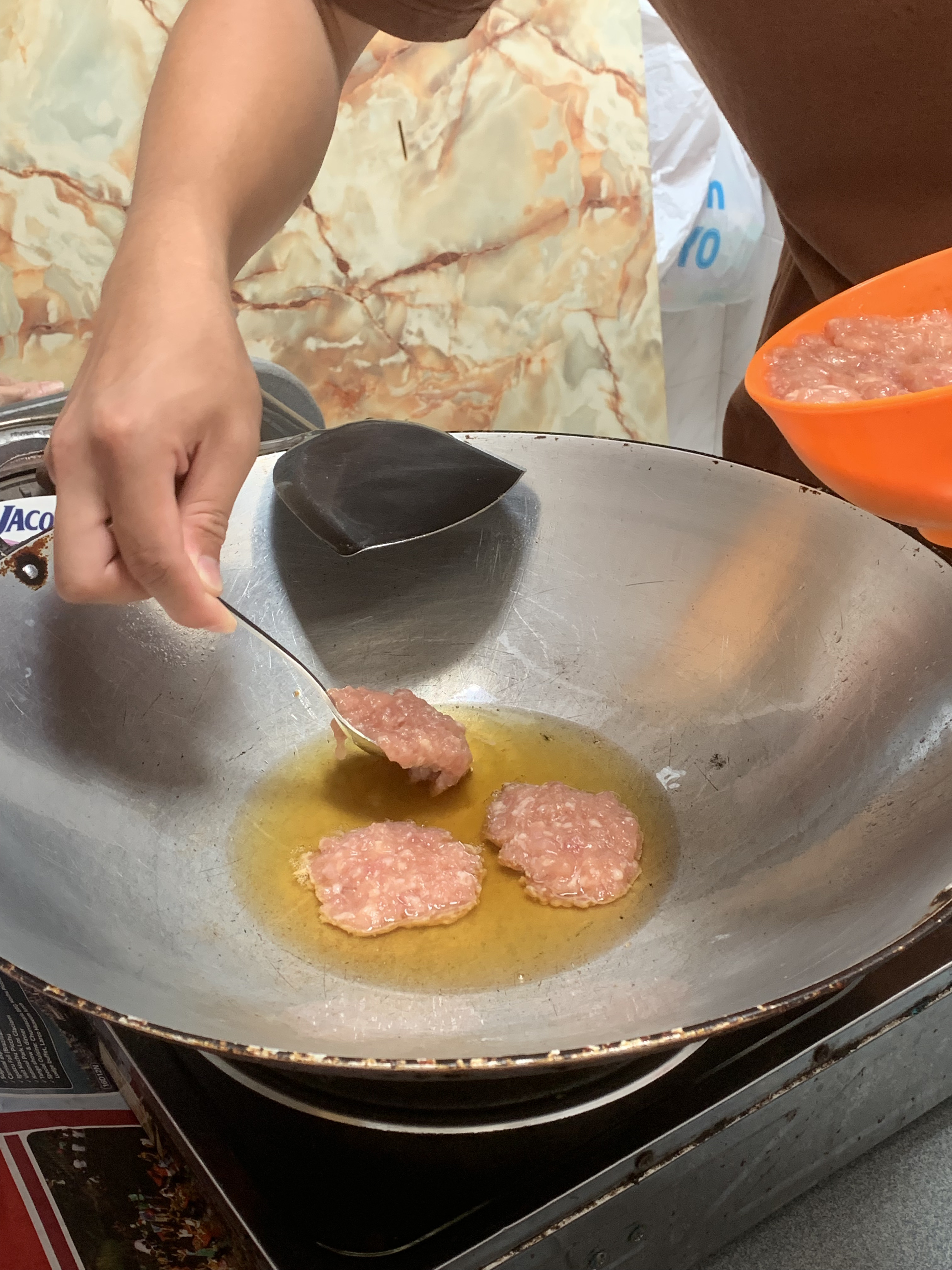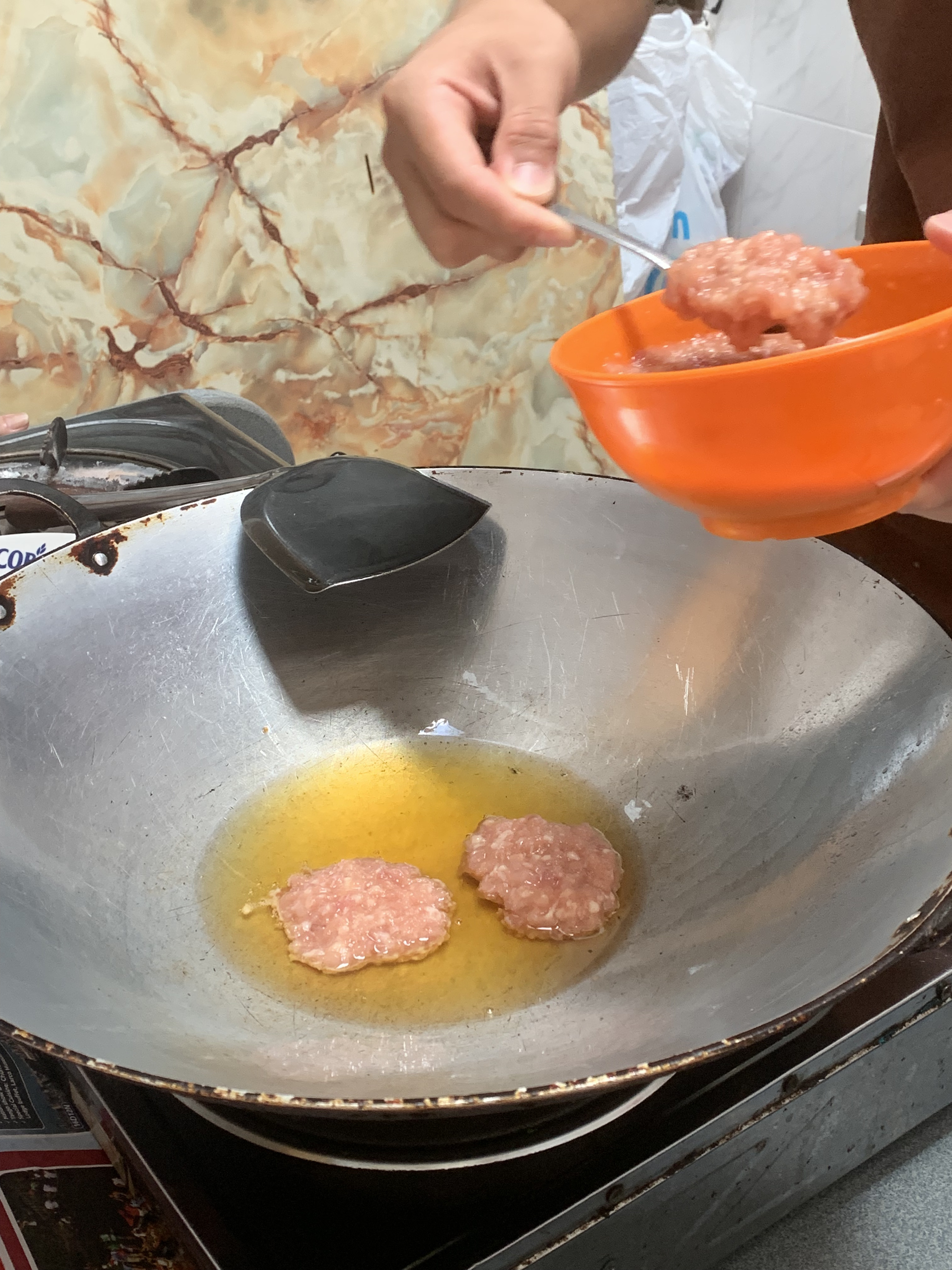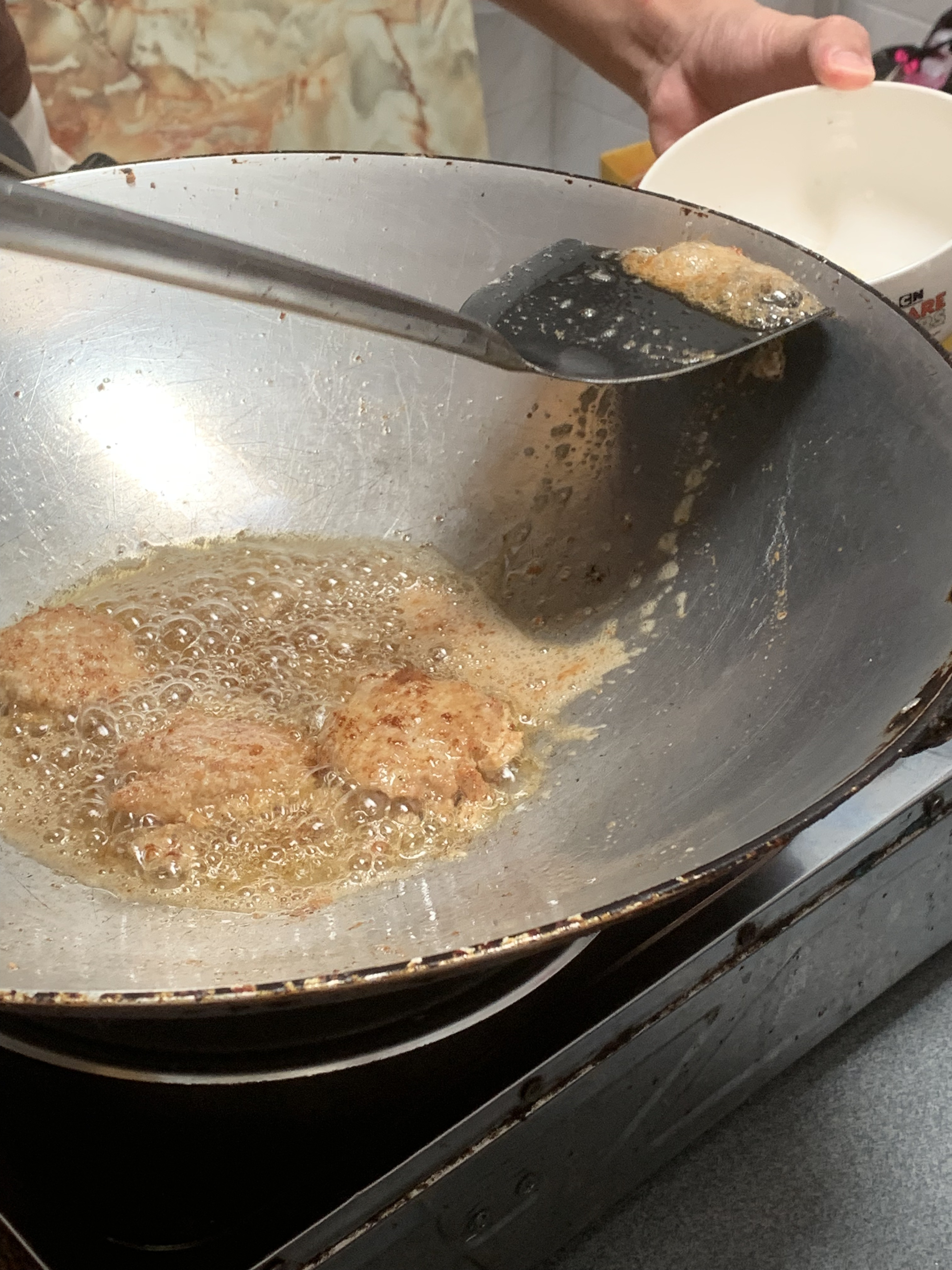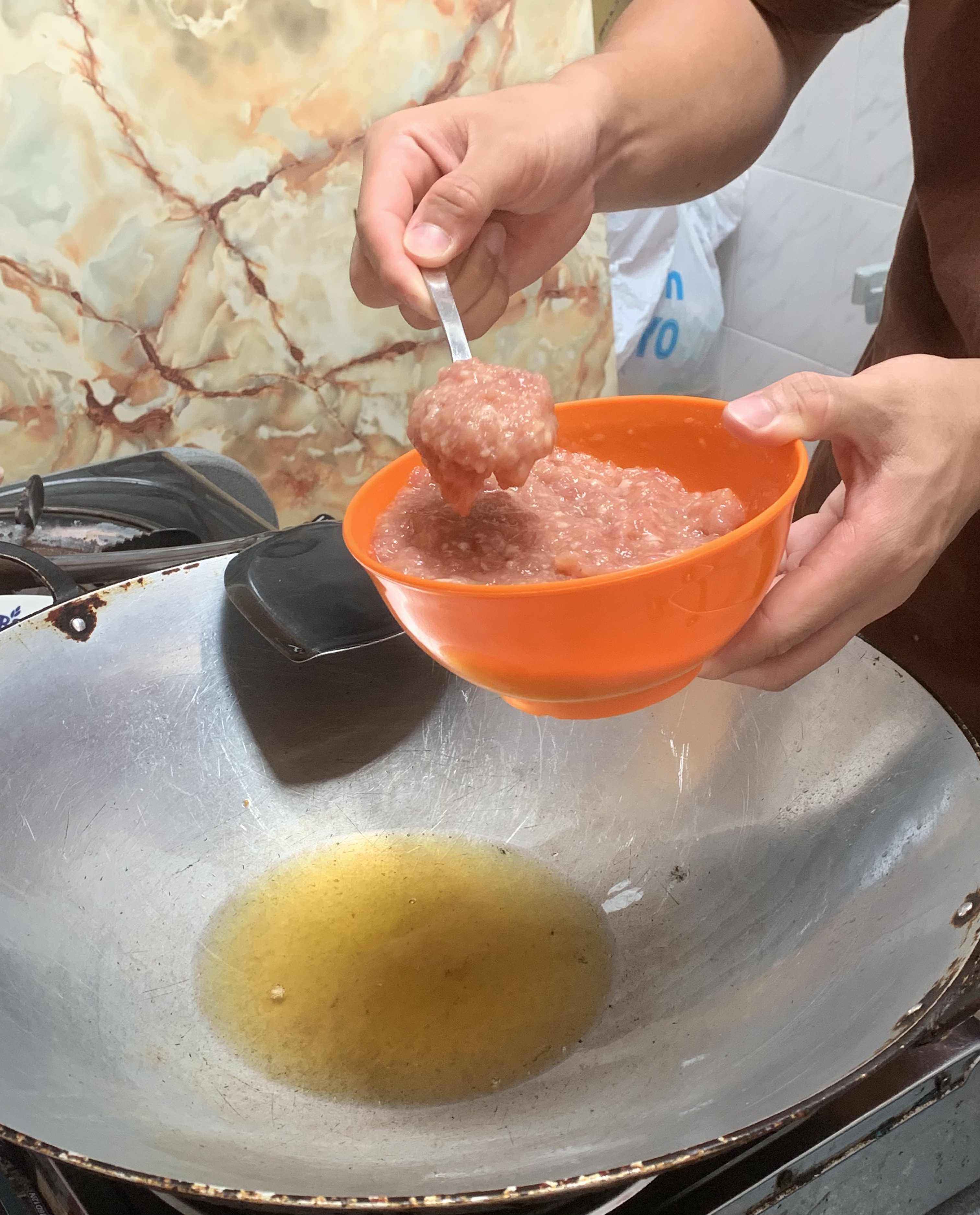 Plop a spoonful of the meat mixture into the hot oil. Flip the meatballs when they're solid and flippable. When nicely brown, push them to the side to drip dry then transfer to a plate. Before adding the next batch of meat, scoop the weird bits out of the oil.