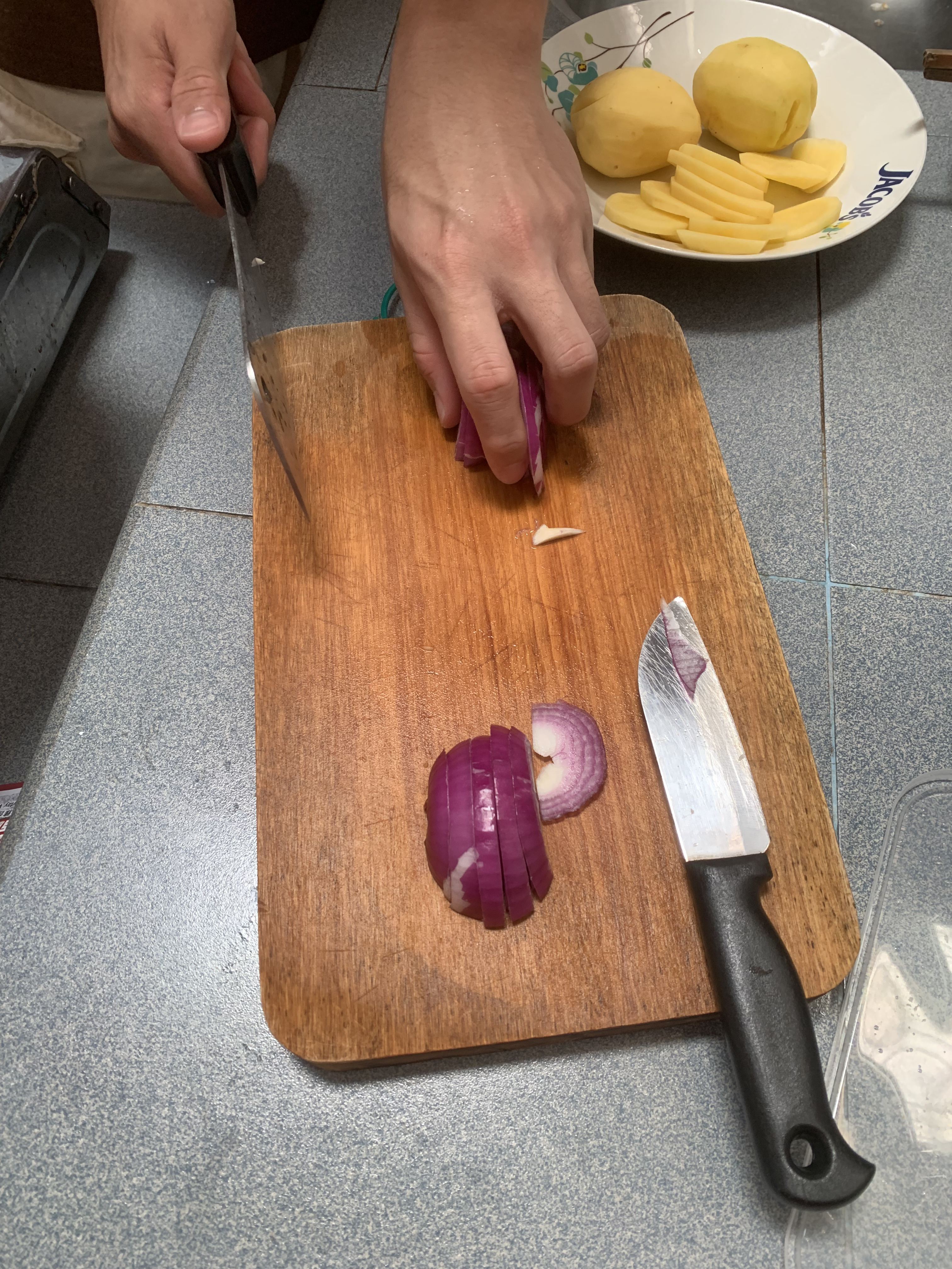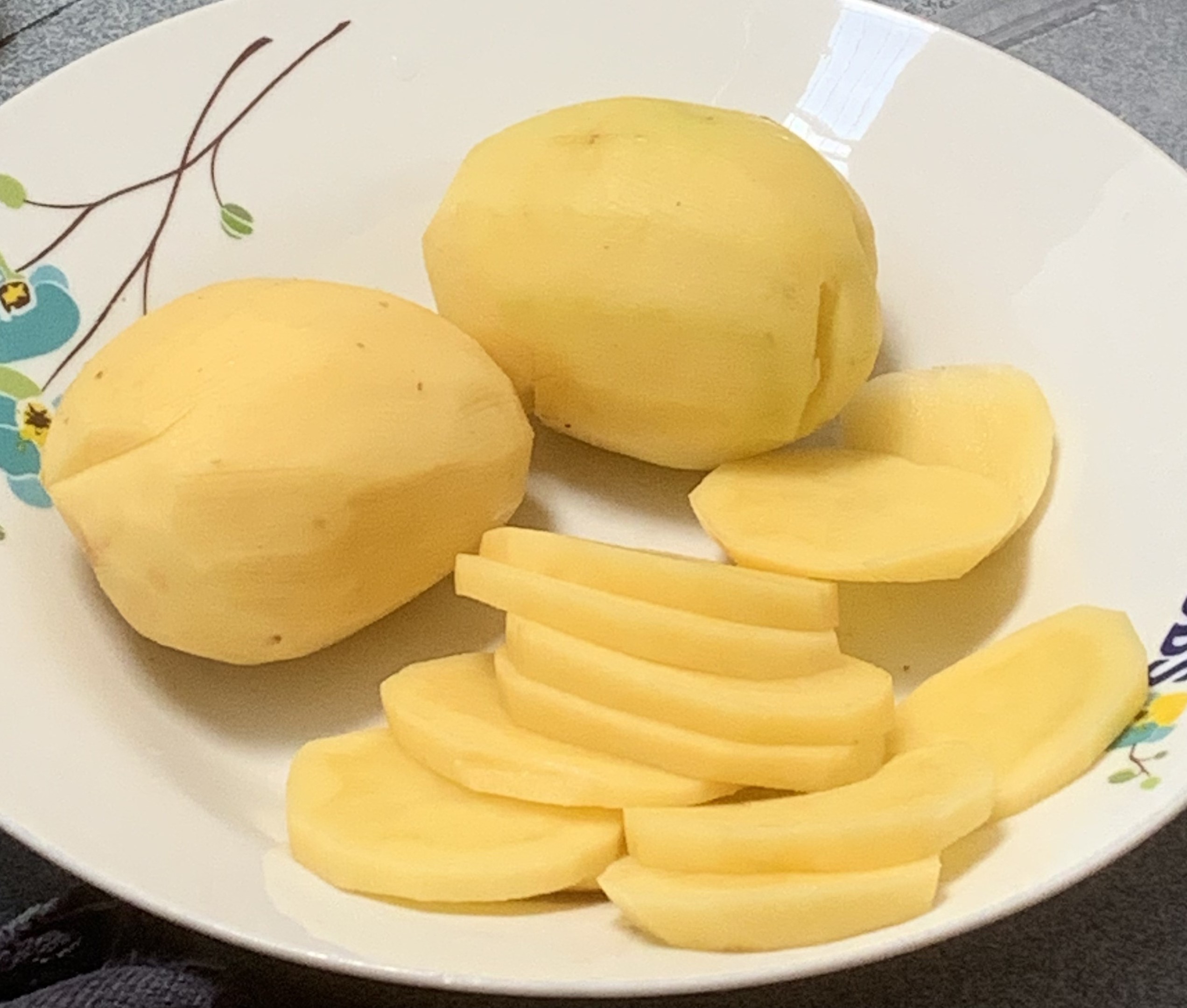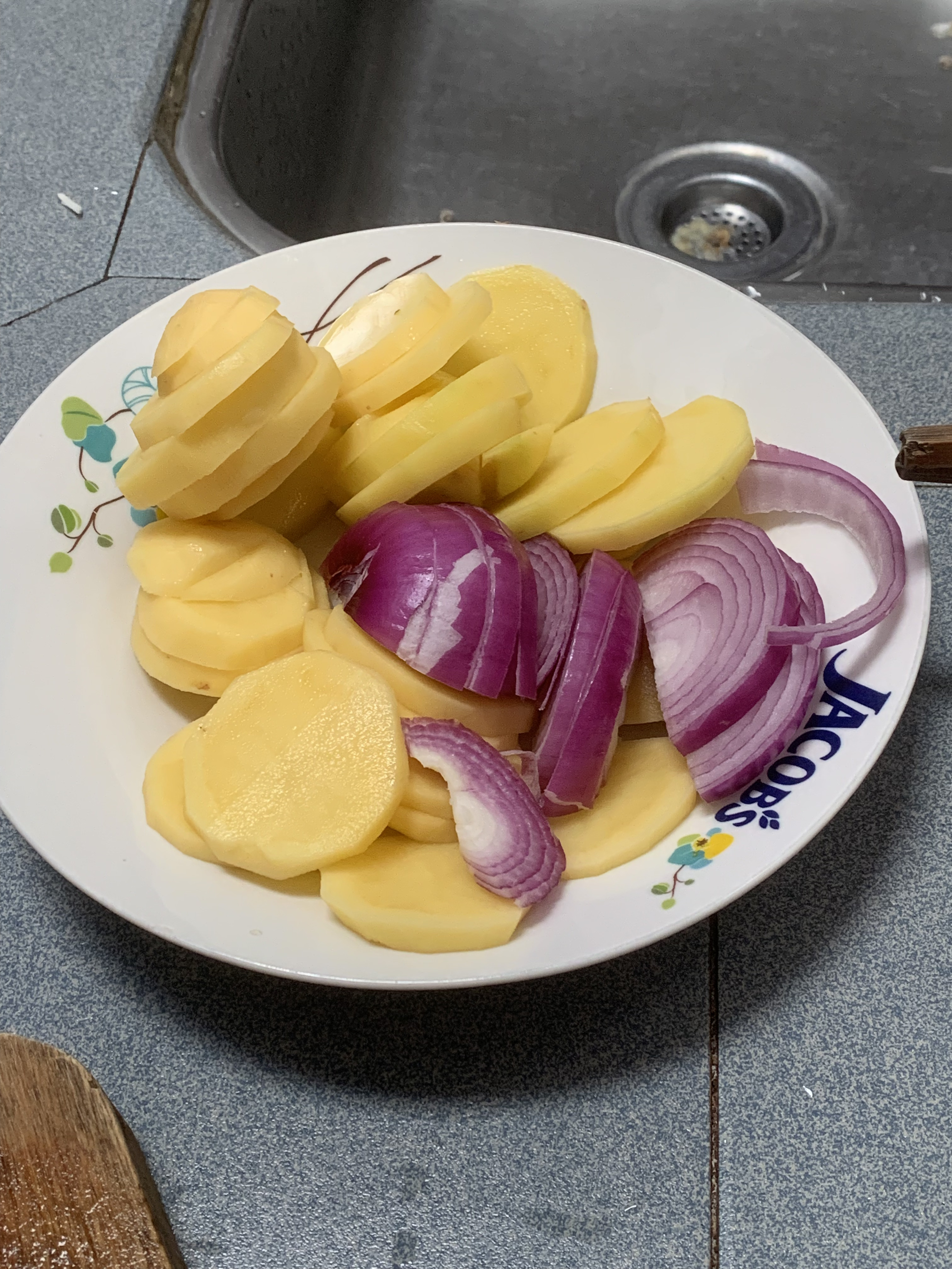 Peel 3 (or fewer) potatoes and 1 onion. Slice the potatoes, onion, and 2 tomatoes. Cut a V to remove the onion and tomato cores.