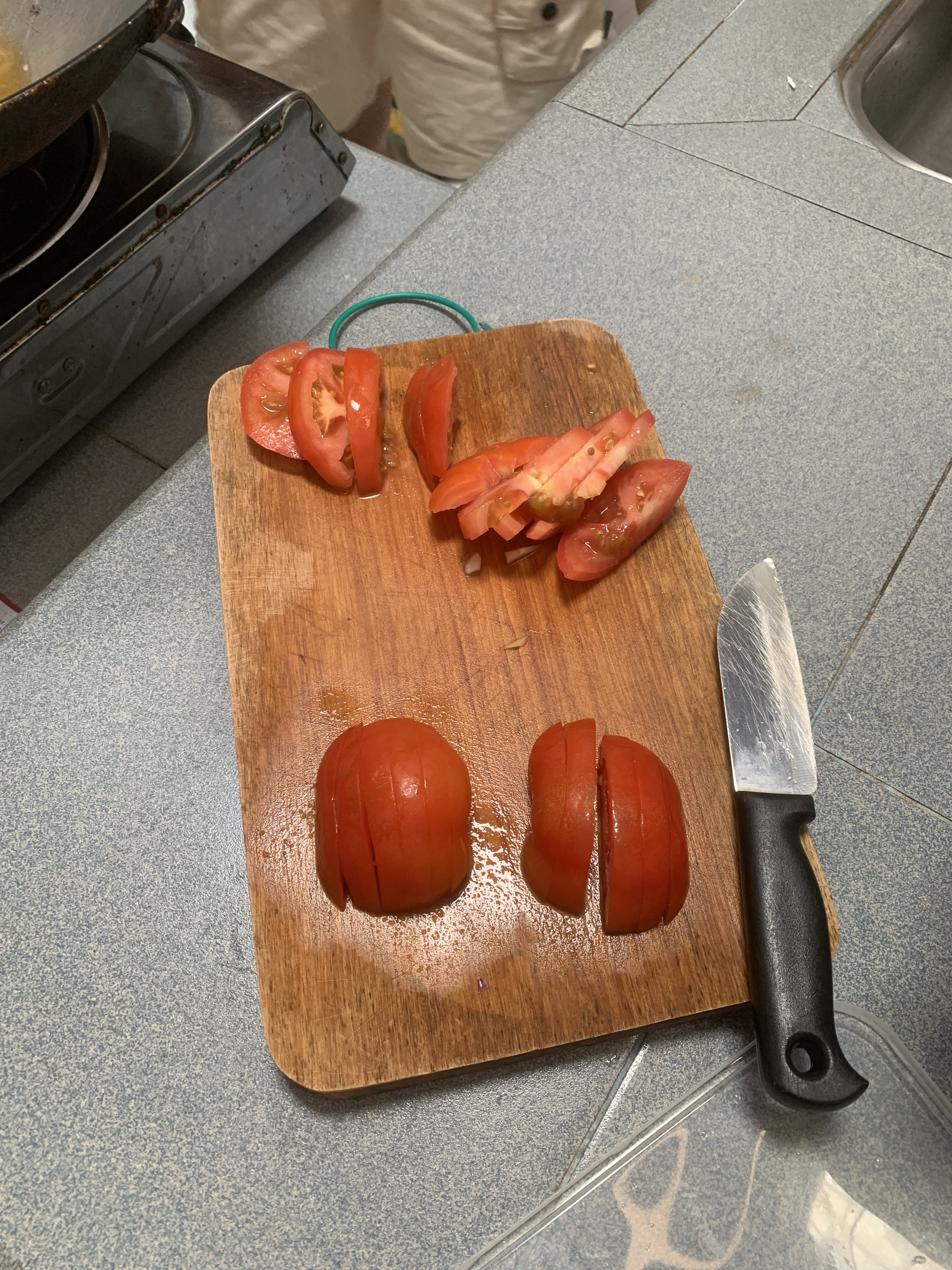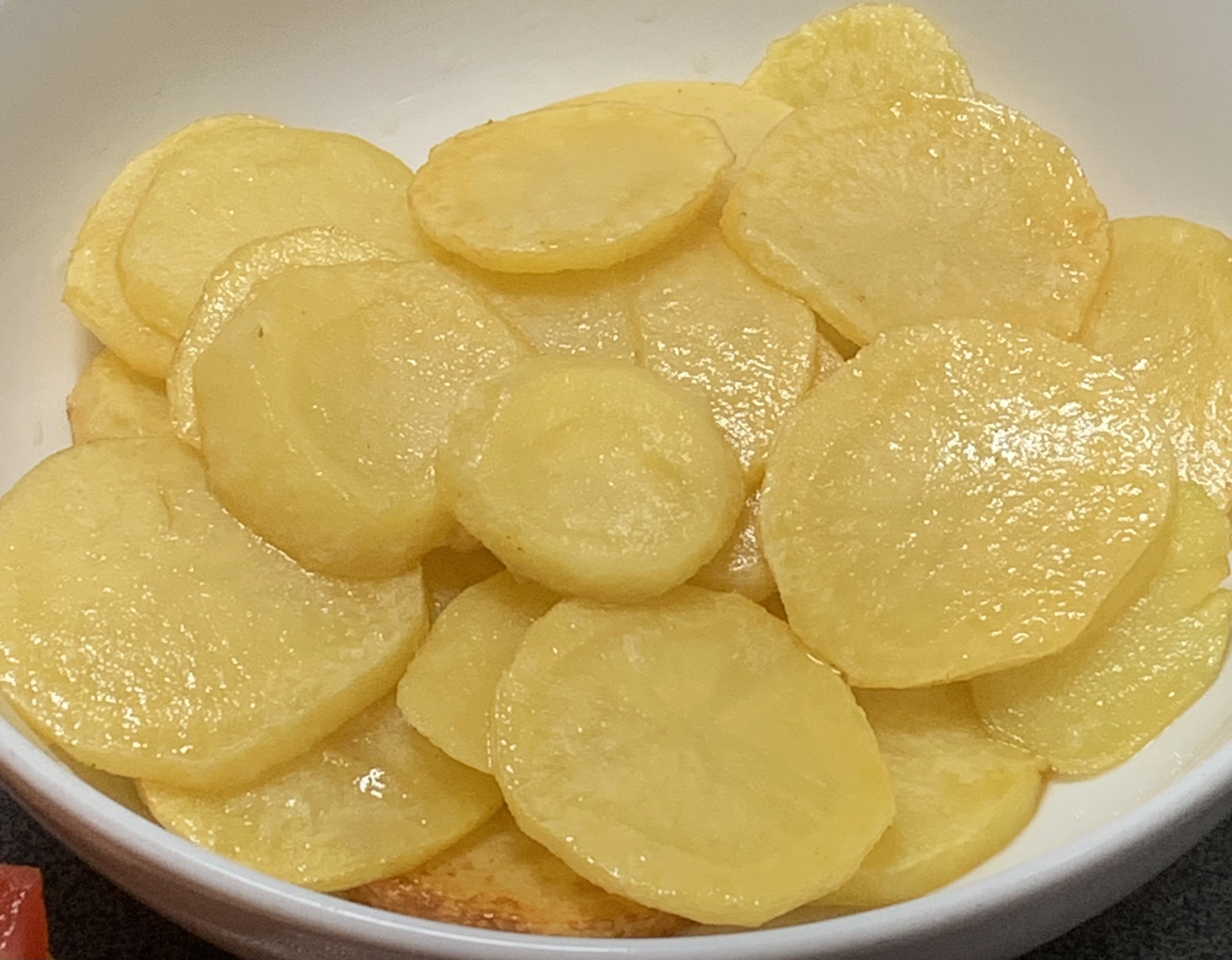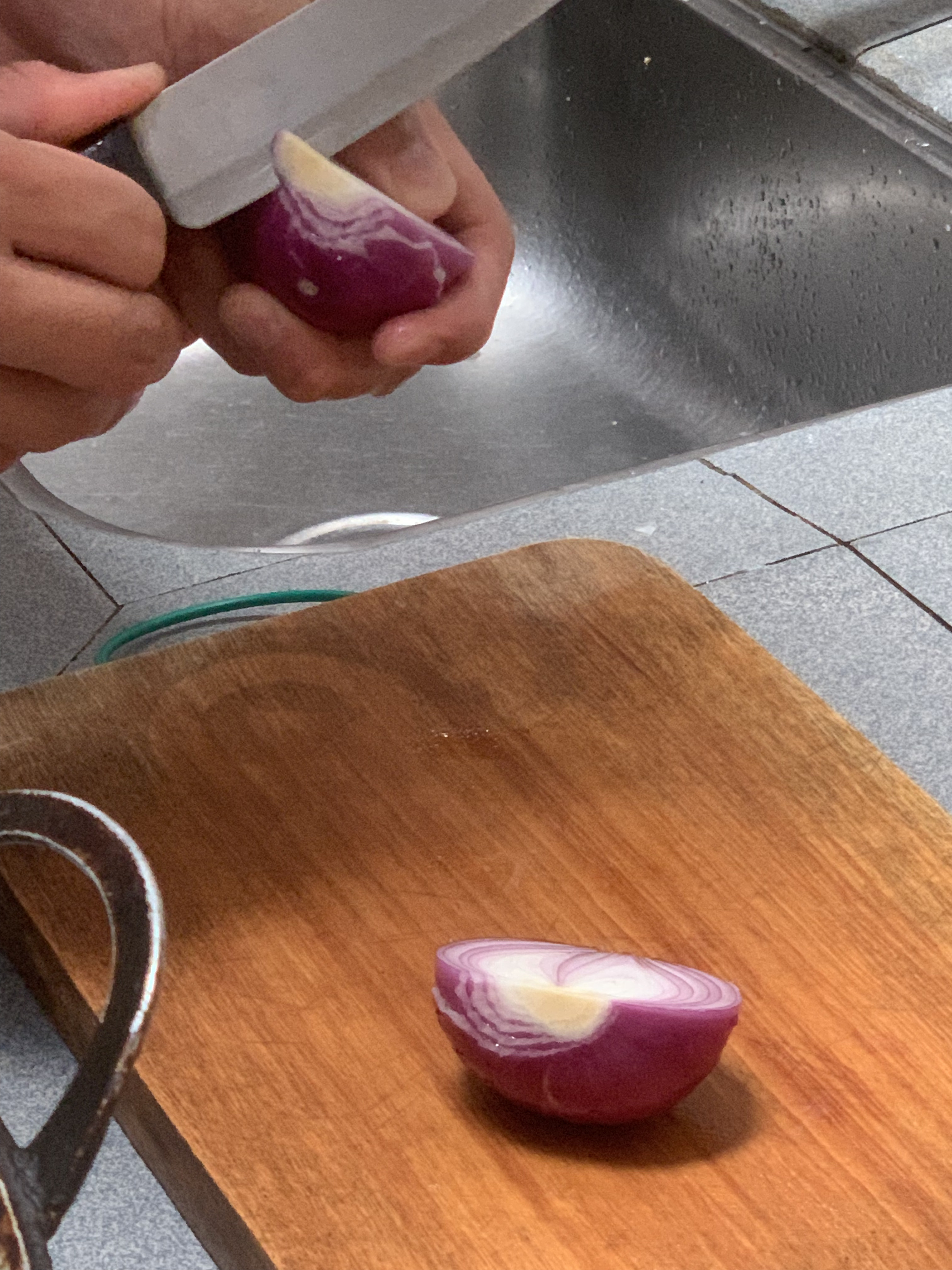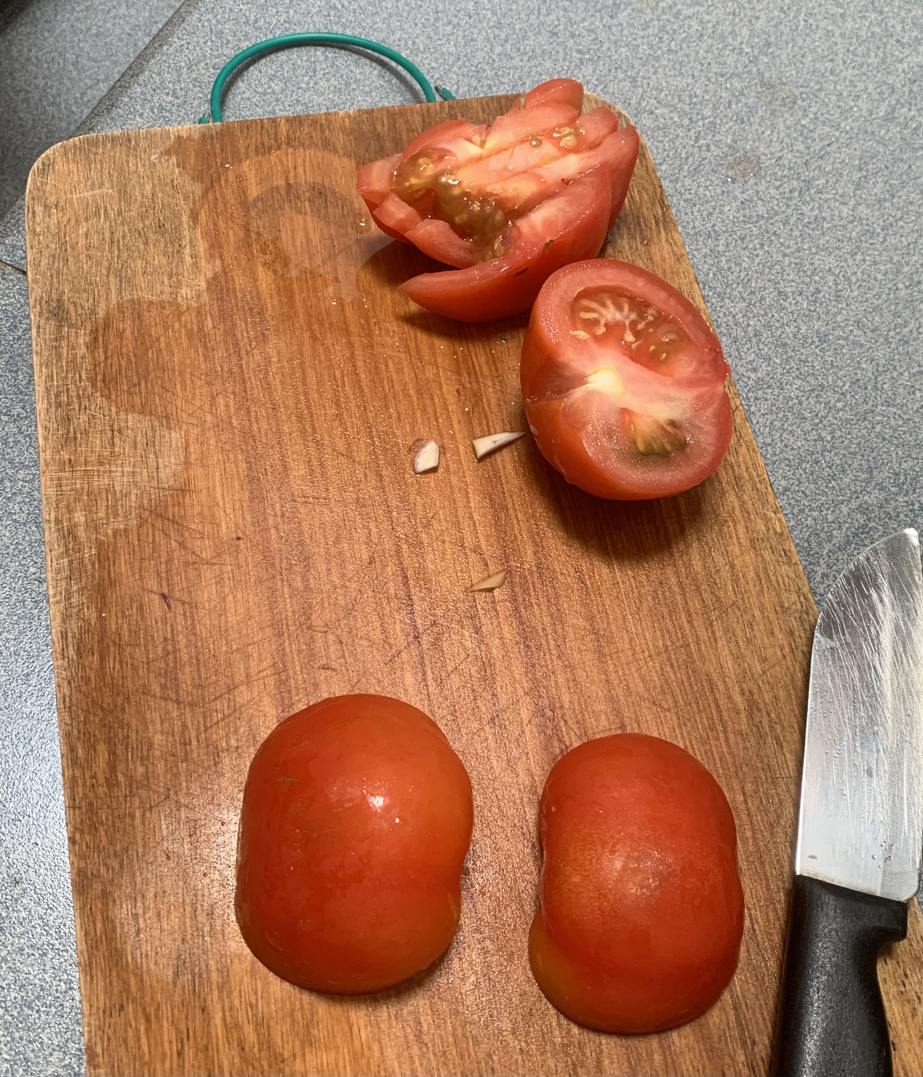 Peel 3 (or fewer) potatoes and 1 onion. Slice the potatoes, onion, and 2 tomatoes. Cut a V to remove the onion and tomato cores.