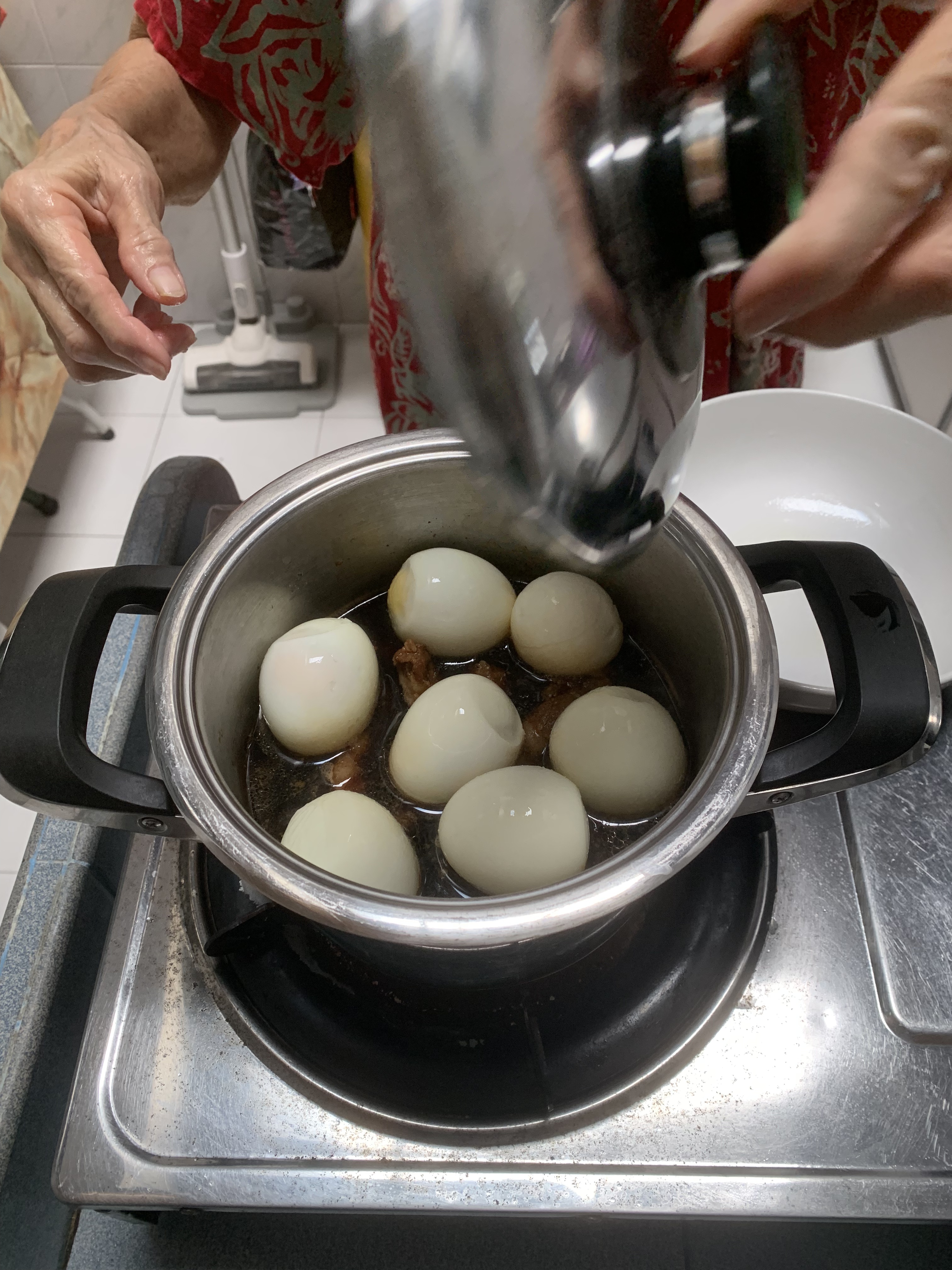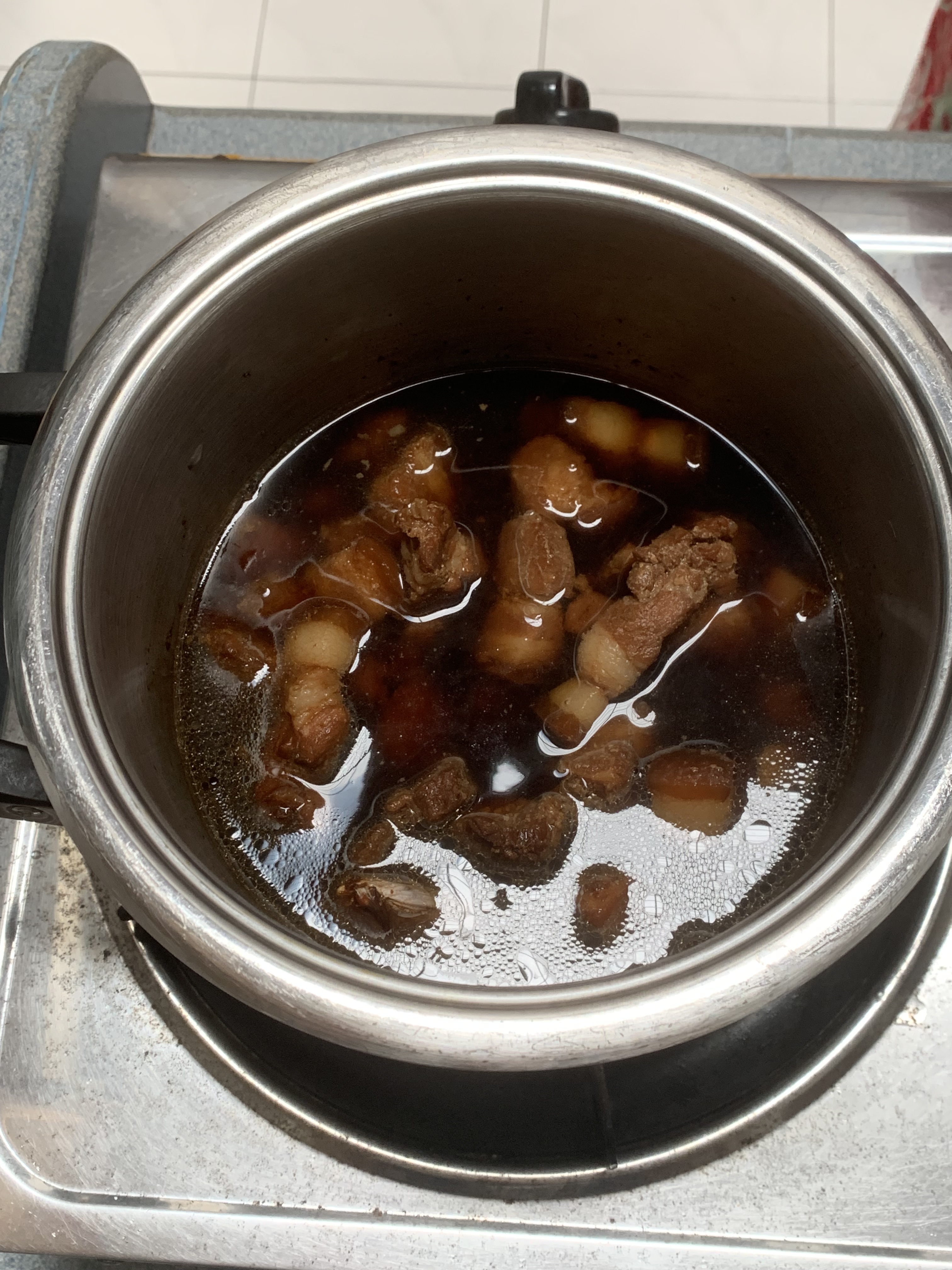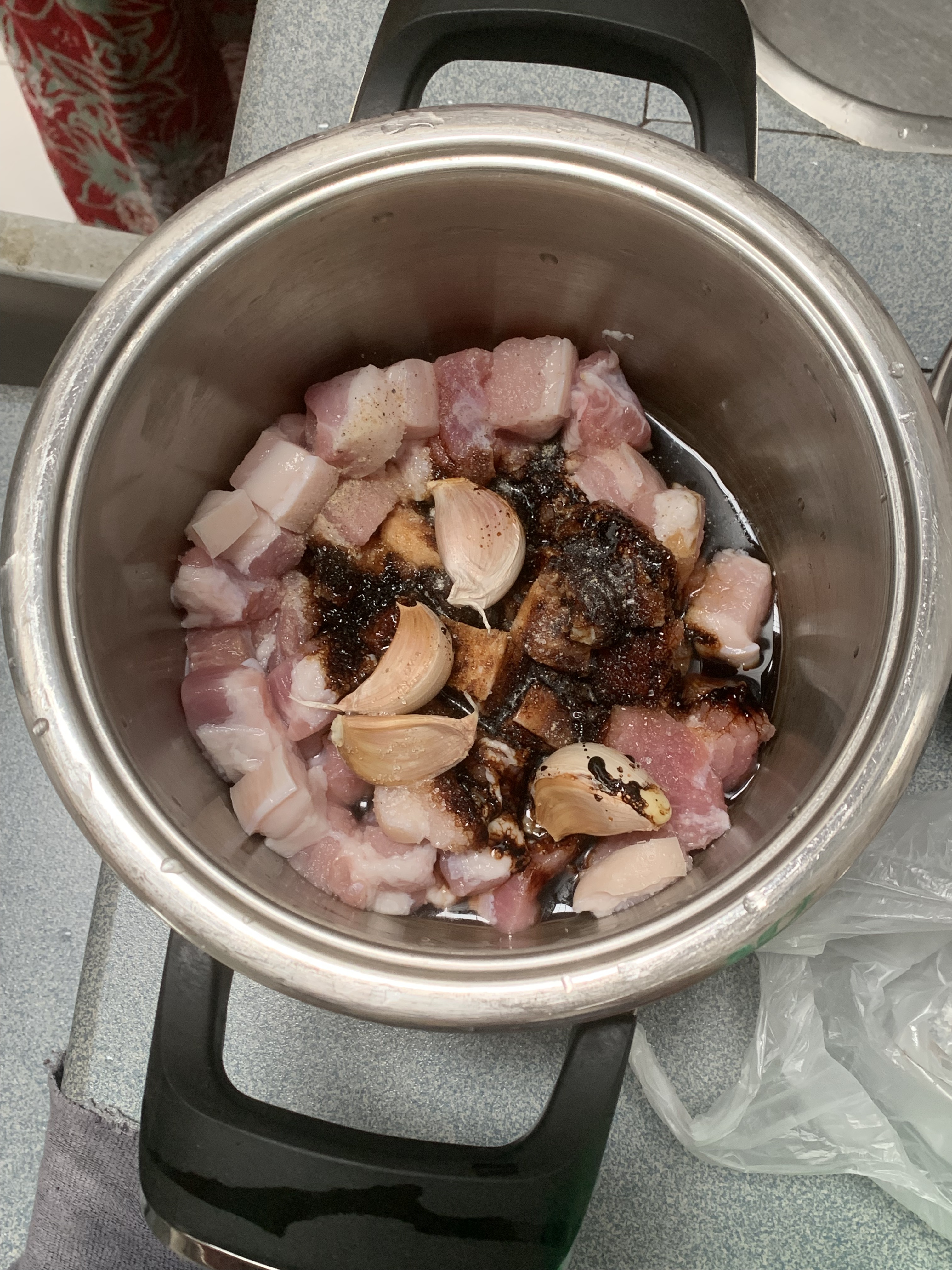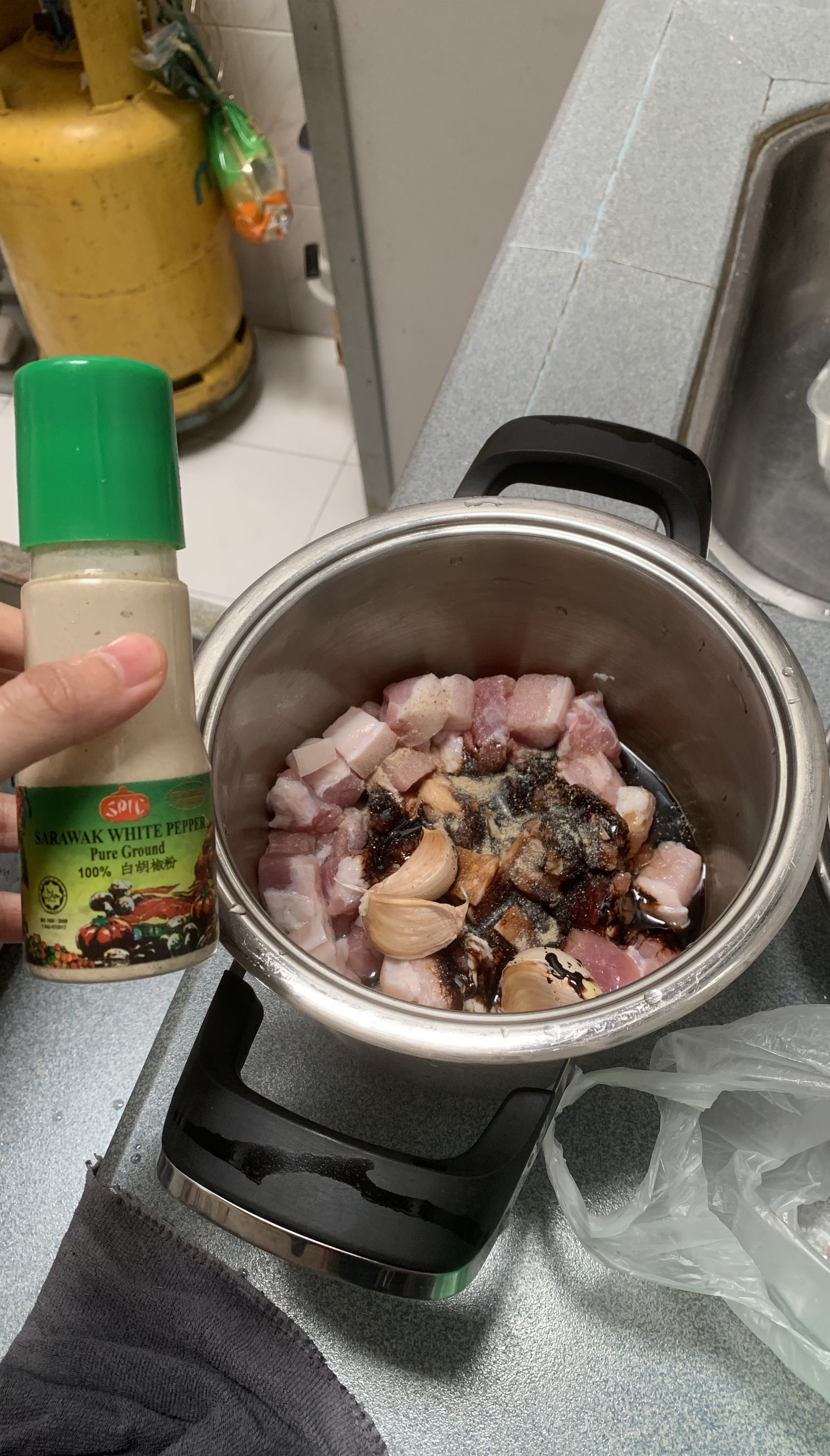Add salt, light soy sauce, dark soy sauce, washed skin-on garlic cloves, white pepper, white sugar. Maybe a bit more dark soy. Cover and cook slowly on low heat.