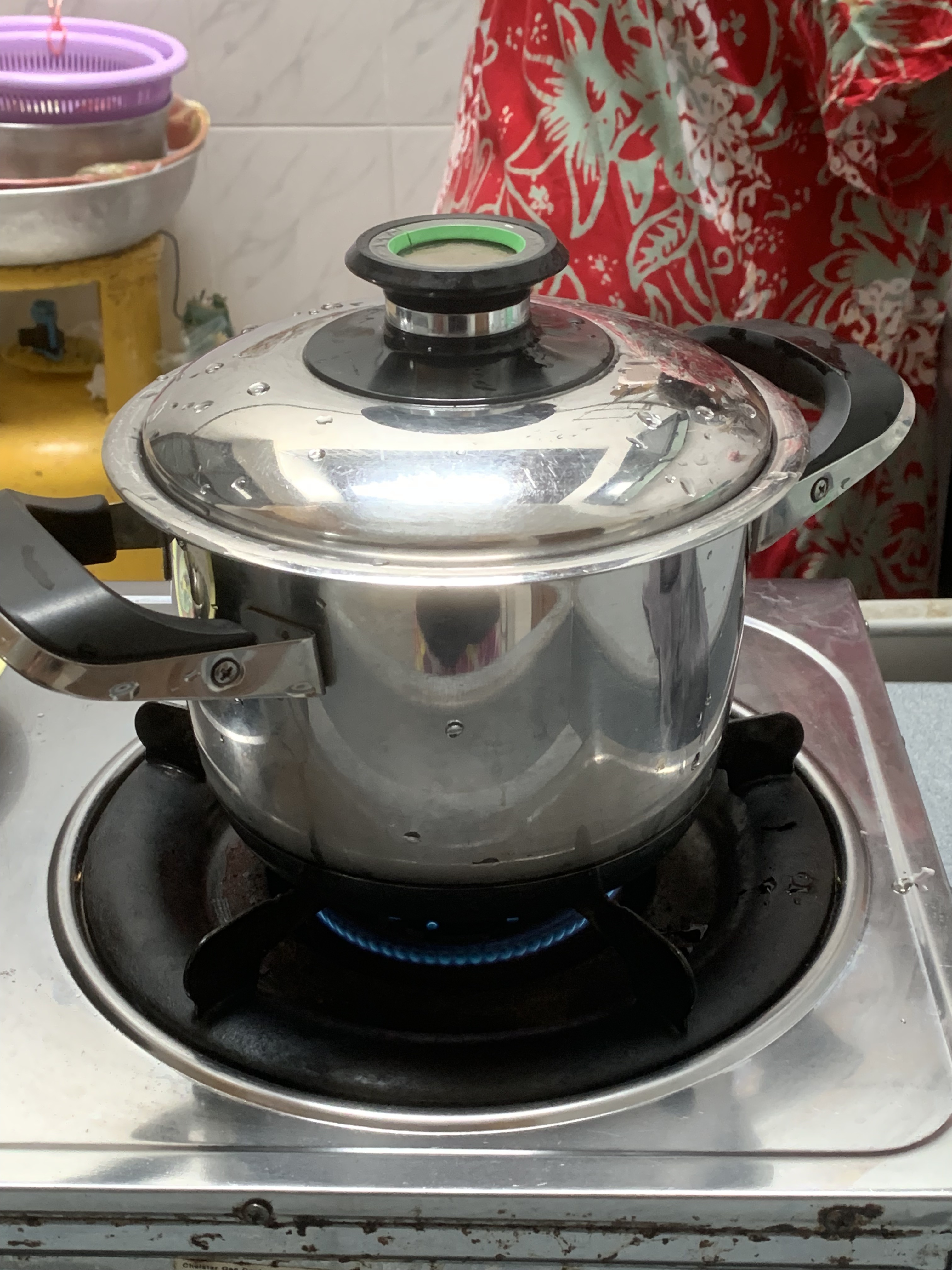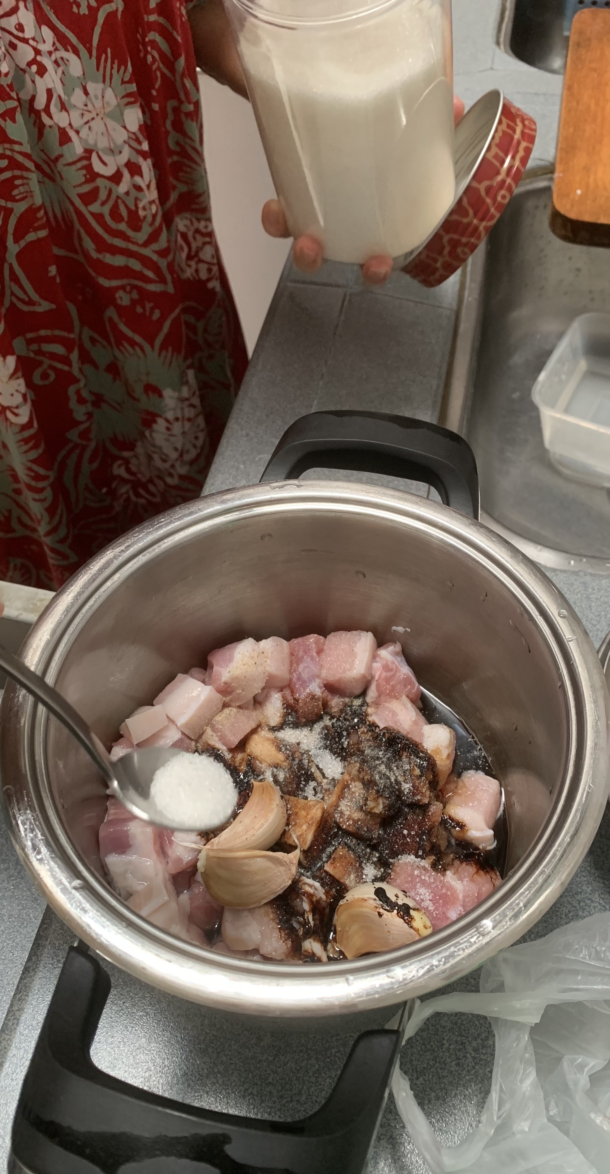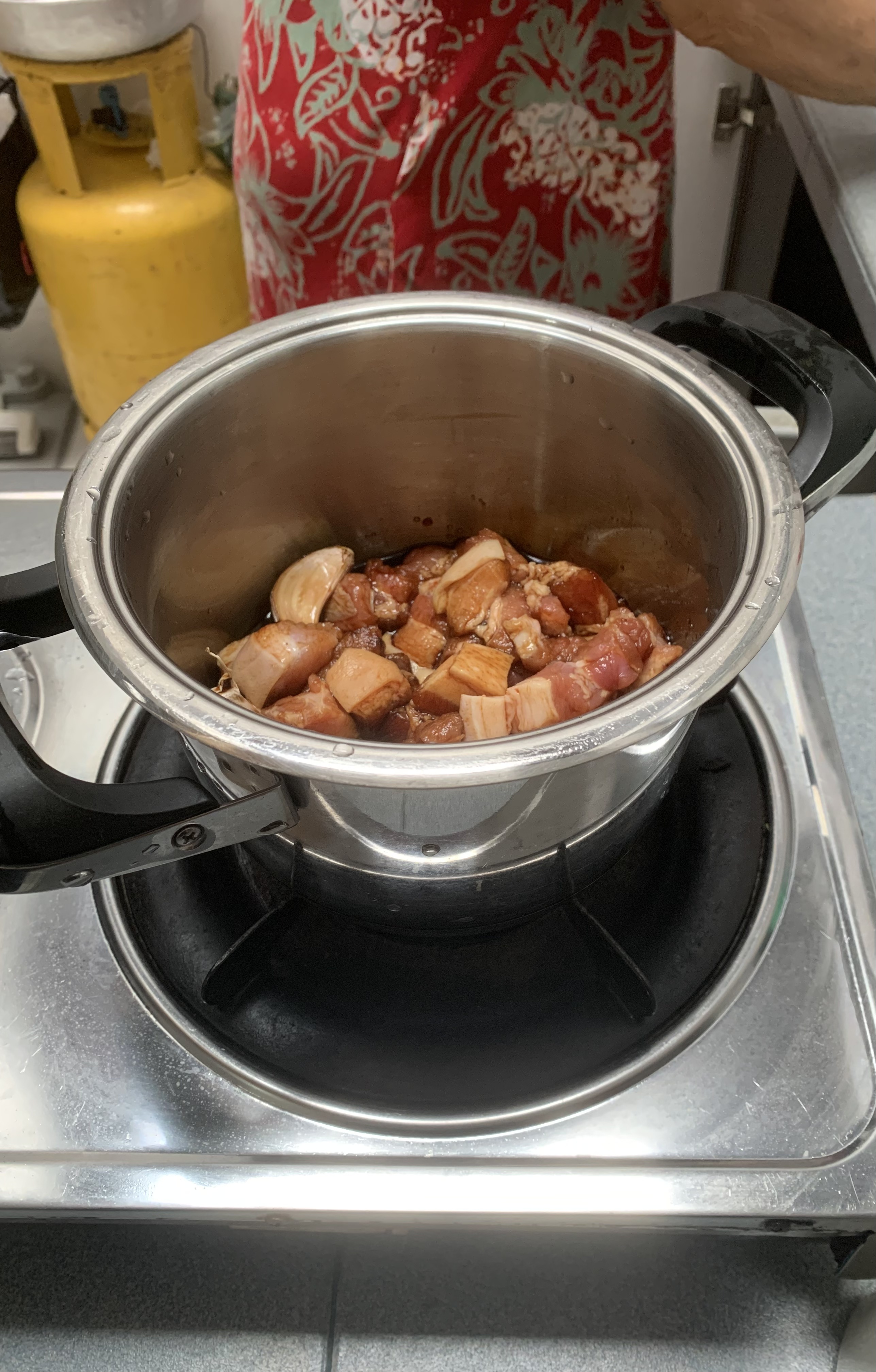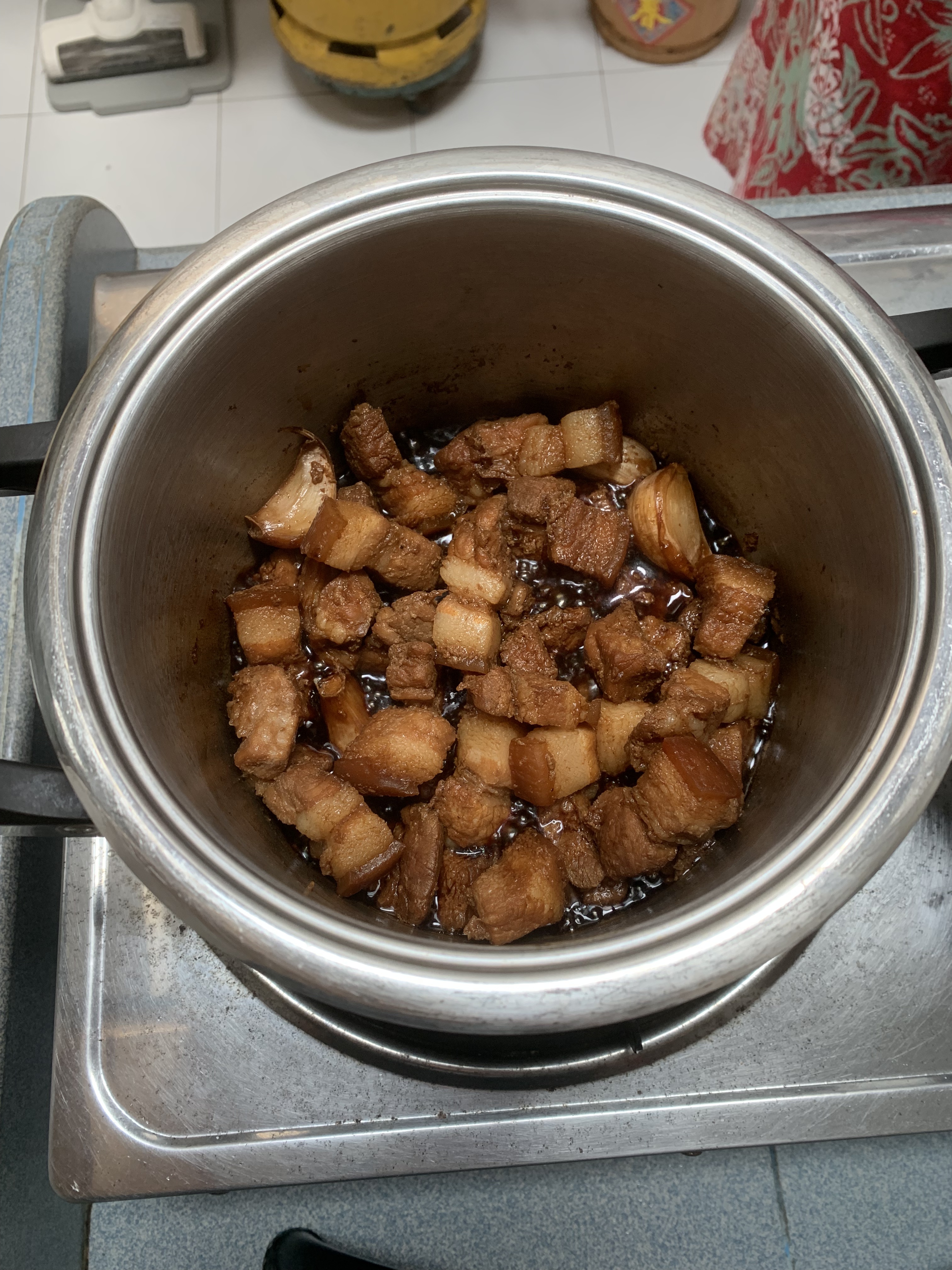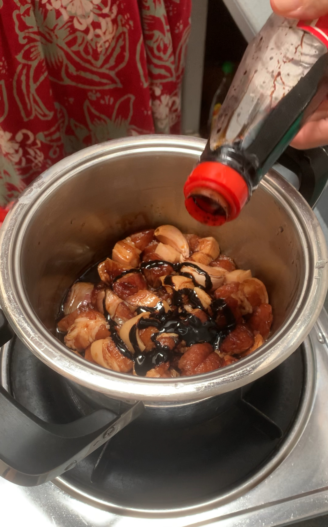 Add salt, light soy sauce, dark soy sauce, washed skin-on garlic cloves, white pepper, white sugar. Maybe a bit more dark soy. Cover and cook slowly on low heat.